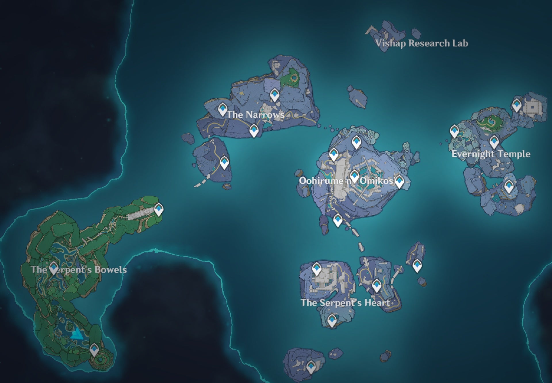 A map for Enkanomiya has emerged since initial information about the new zone has come out, showing that the zone seems to be composed of several rocky mountains built with substantial structural development throughout. We also see several names attached to these land masses, including the Vishap Research Lab, Evernight Temple, and The Narrows.