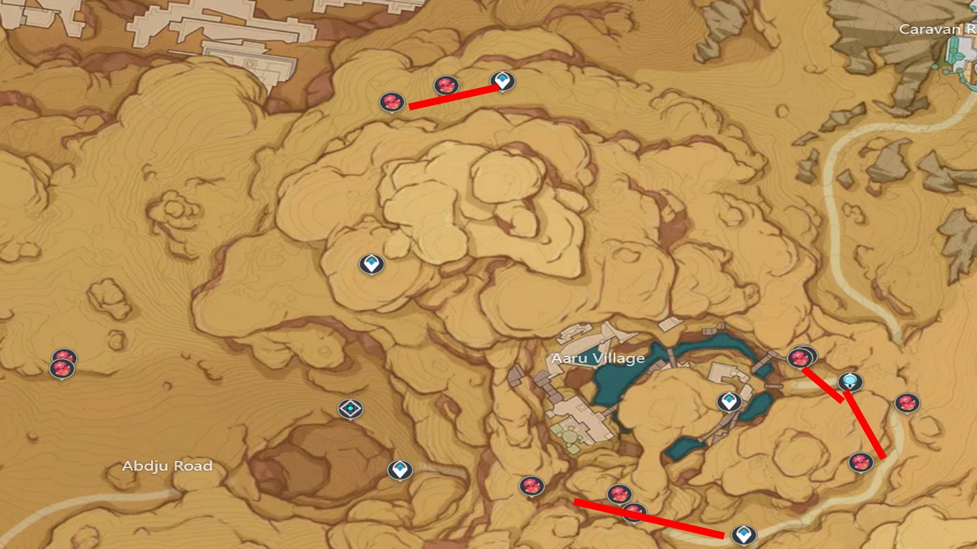 Start at the teleport marker above Aaru Village, then head to the Statue of the Seven and collect the Redcrest there. You can walk to the southern waypoint or just teleport there. Then head southeast from it to grab the next set of Redcrest.