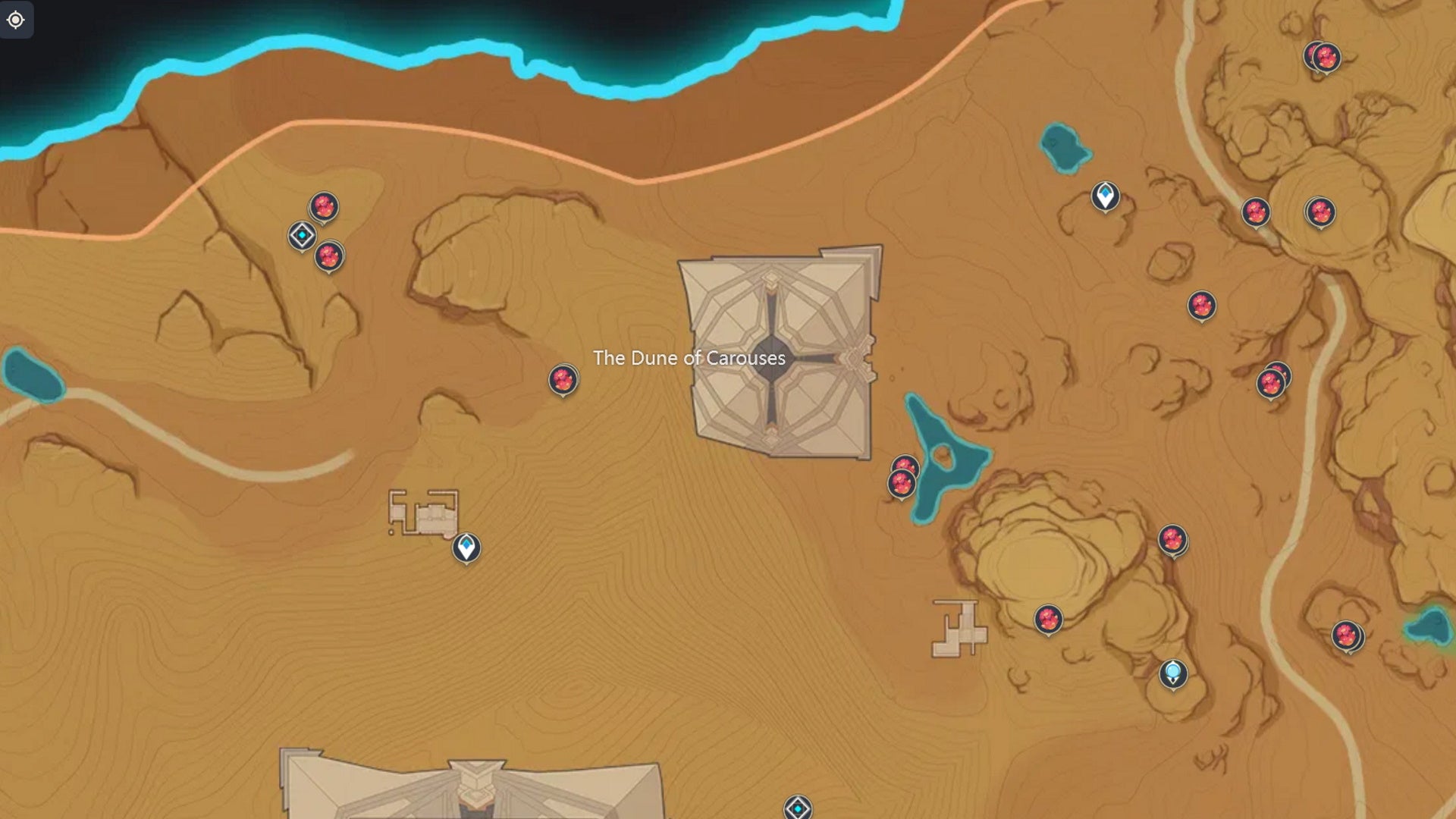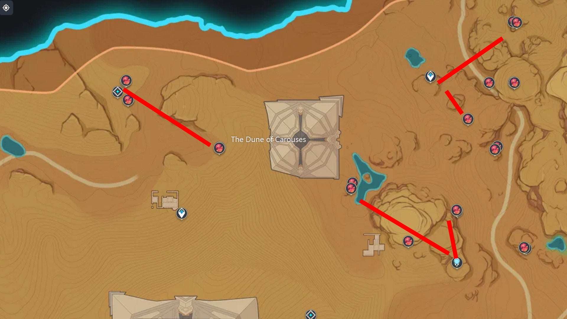 Finally is the Dune of Carouses. Head to the Garden of Endless Pillars Domain and gather up the Redcrest around it. Make sure to solve the puzzle first, or you can't access the fruits. Then you can either start from the northeastern waypoint or travel south from the Eye of the Sands, gathering Scarabs along the way.