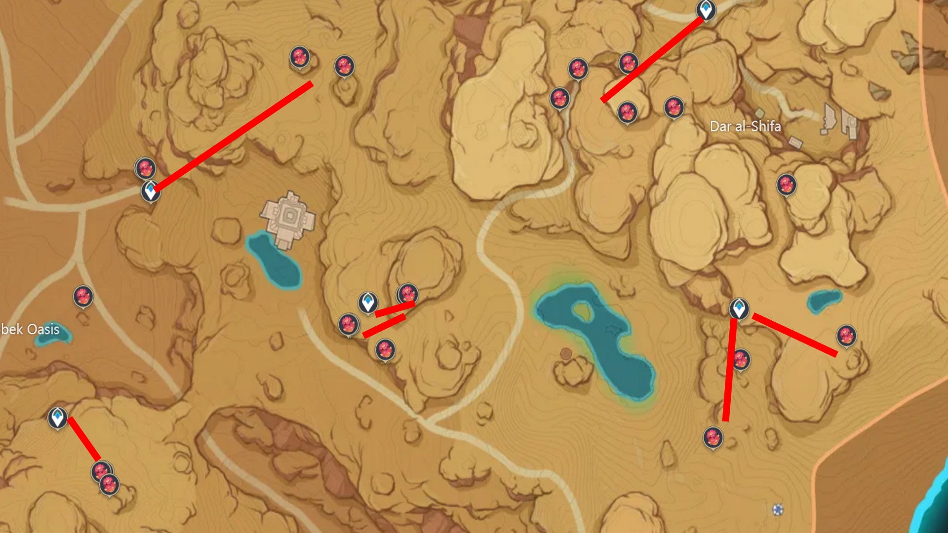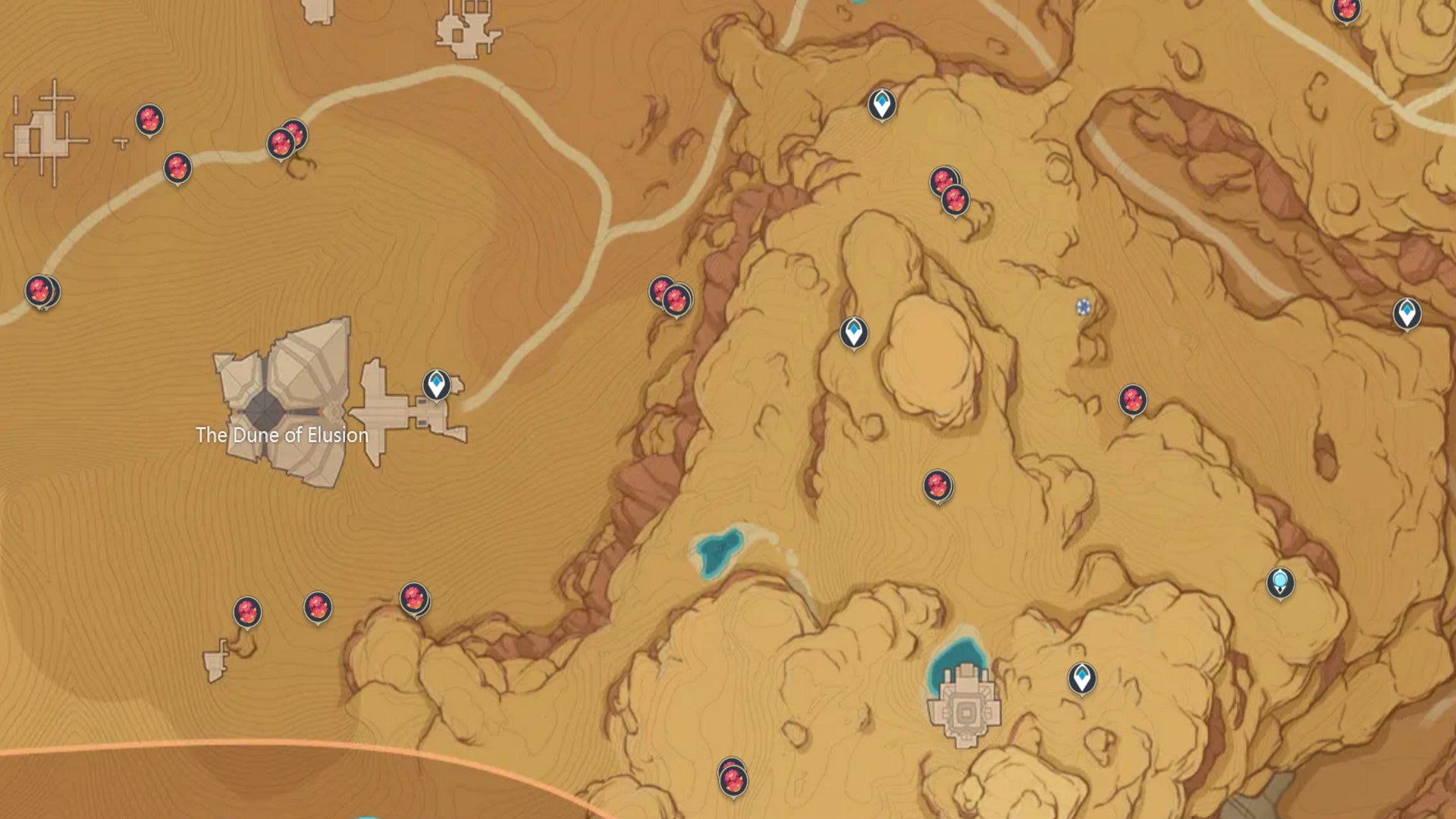 Redcrest only grows in Sumeru’s desert, the Great Red Sand, where you’ll find it popping up on cactus plants. Not every plant sprouts a Redcrest, and there are only 79 scattered across the vast, arid expanse. Most are clustered in the east, around Aaru village, but some also line the road near the Dune of Elusion and south of the Eye of the Sands.