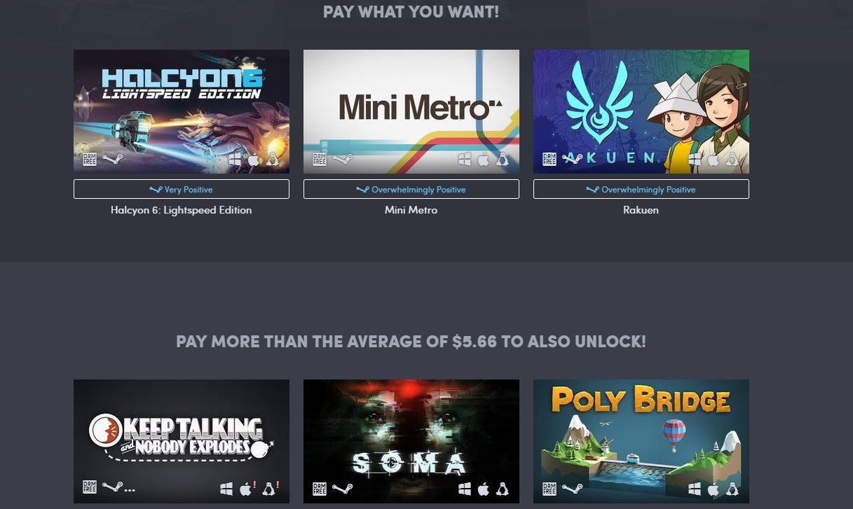 Beating the average, which currently stands at $5.67, expands it to include excellent co-op puzzle game Keep Talking and Nobody Explodes, horror/narrative adventure SOMA, and Poly Bridge.