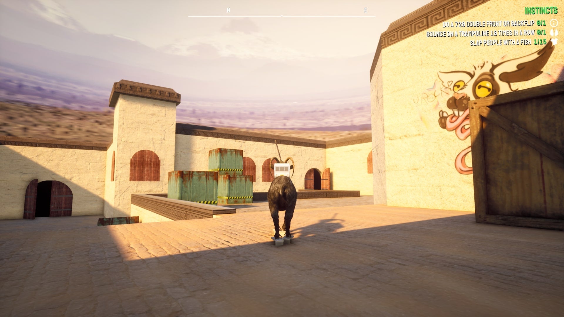Your quests and instincts also reward you with in-game currency, which can be used to purchase new skins. And not only can you play as a pig, giraffe, or Tony Shark (who is, as you might expect, a shark on a skateboard), but you can also use your hard-earned points to buy all kinds of new cosmetics. I eventually had Pilgor hopping around San Angora in bunny slippers, with a tray of sushi precariously balanced on their back, but you can get so much more creative and much more personal in Goat Simulator 3 if you wish.
