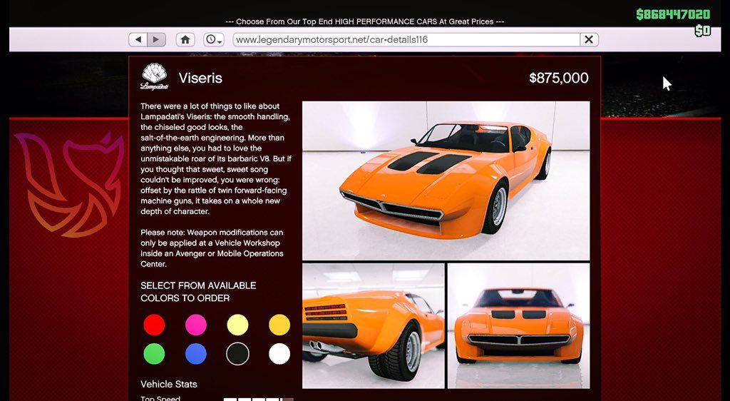 That's rather inexpensive for a GTA 5 sports car. Available through Legendary Motorsports, the Viseris comes in various colors and modifications include forward facing twin machine guns. It also tops out at 146.5 mph (235.7 km/h). Nice.