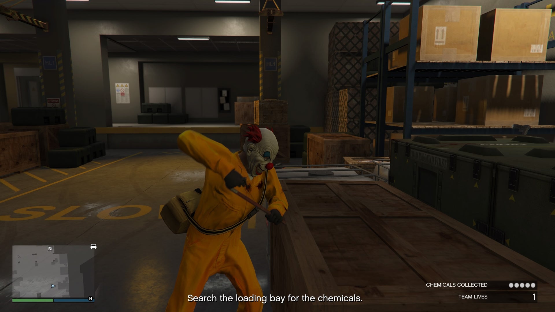 Once you're inside the building, you need to shoot your way through the guards and eliminate all of the ones in the loading bay. Once they're down, walk up to the large wooden crates in the area and search all of them until you've collected enough chemicals.