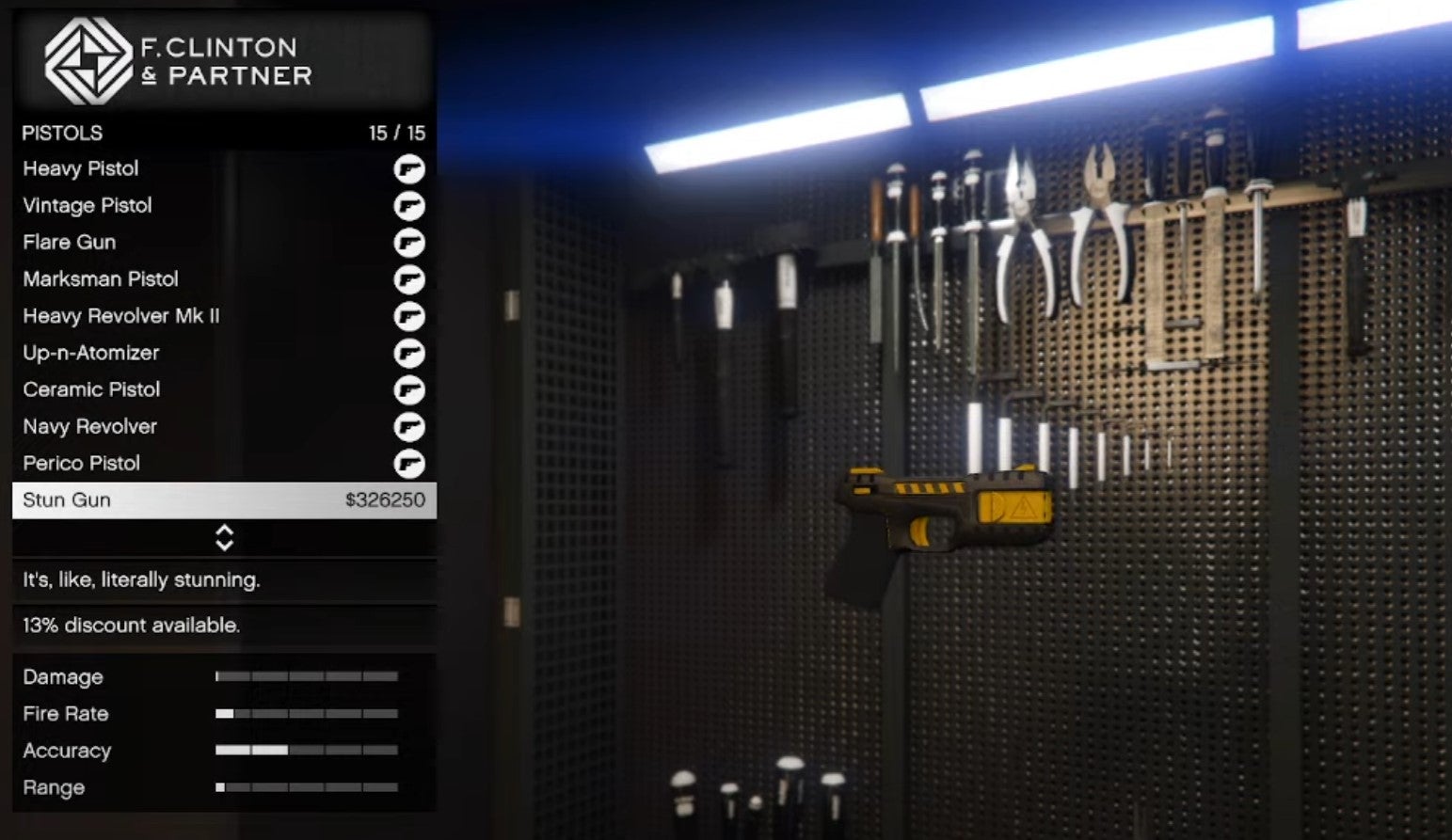 You can find the Stun Gun at the bottom of the Pistol menu, which costs $326,250.