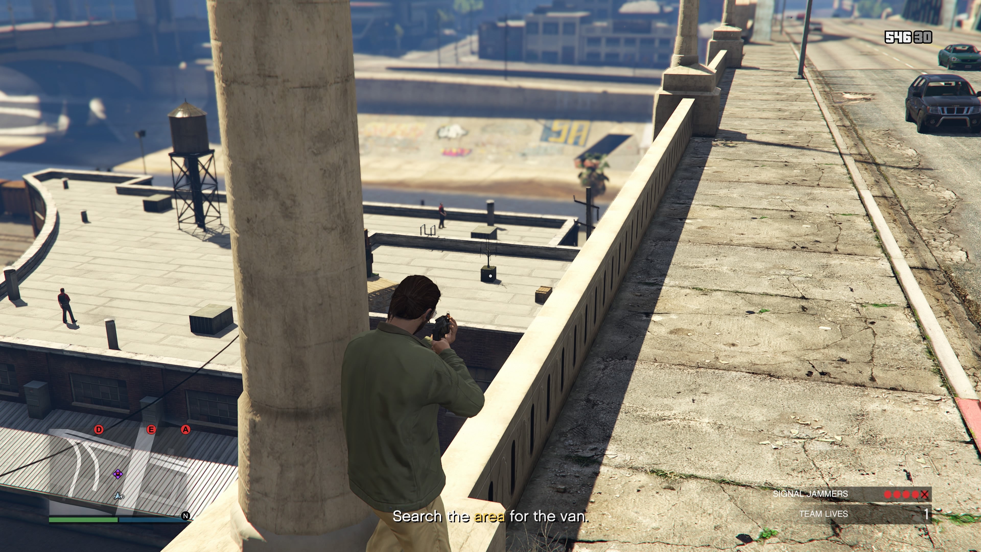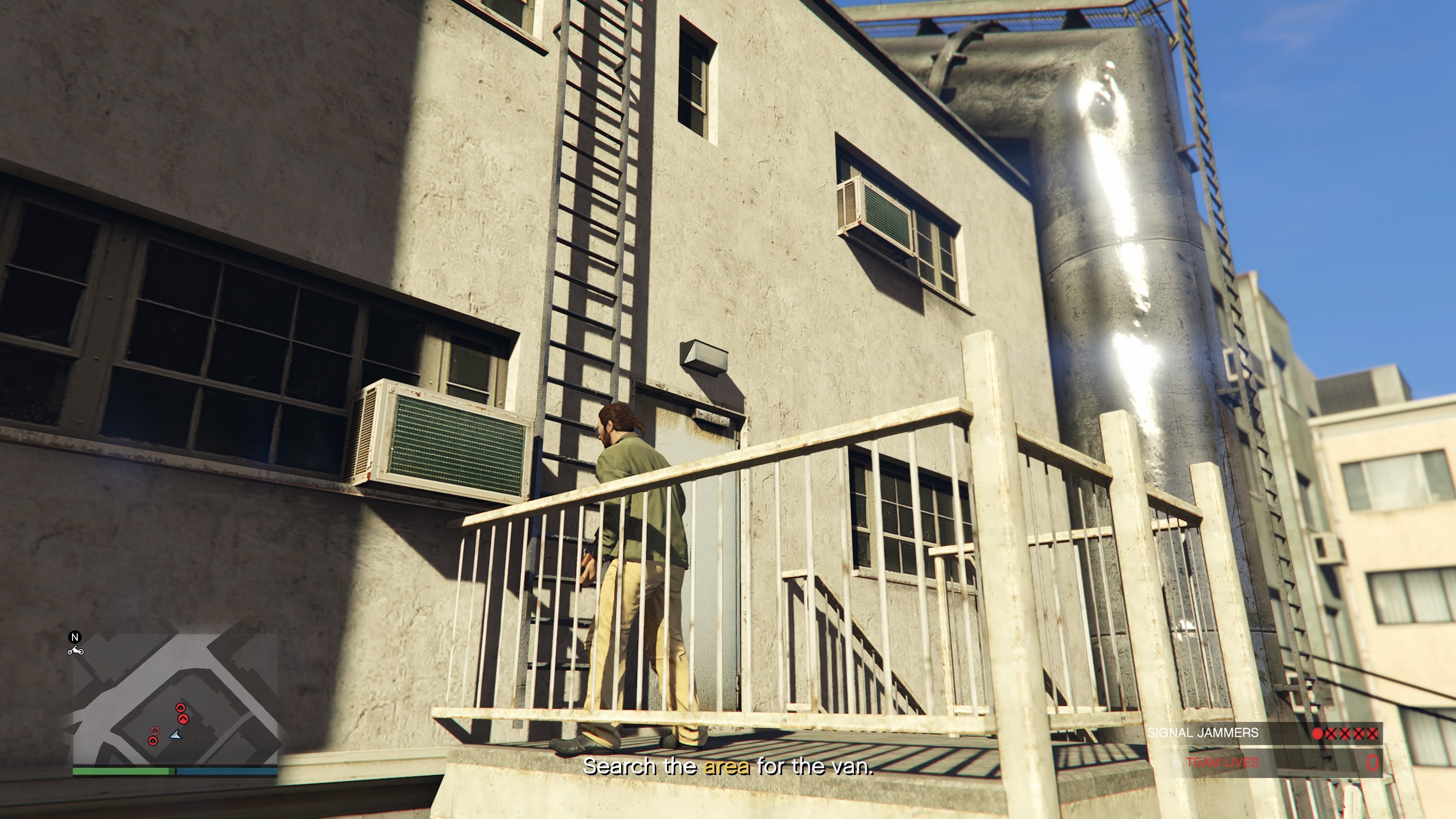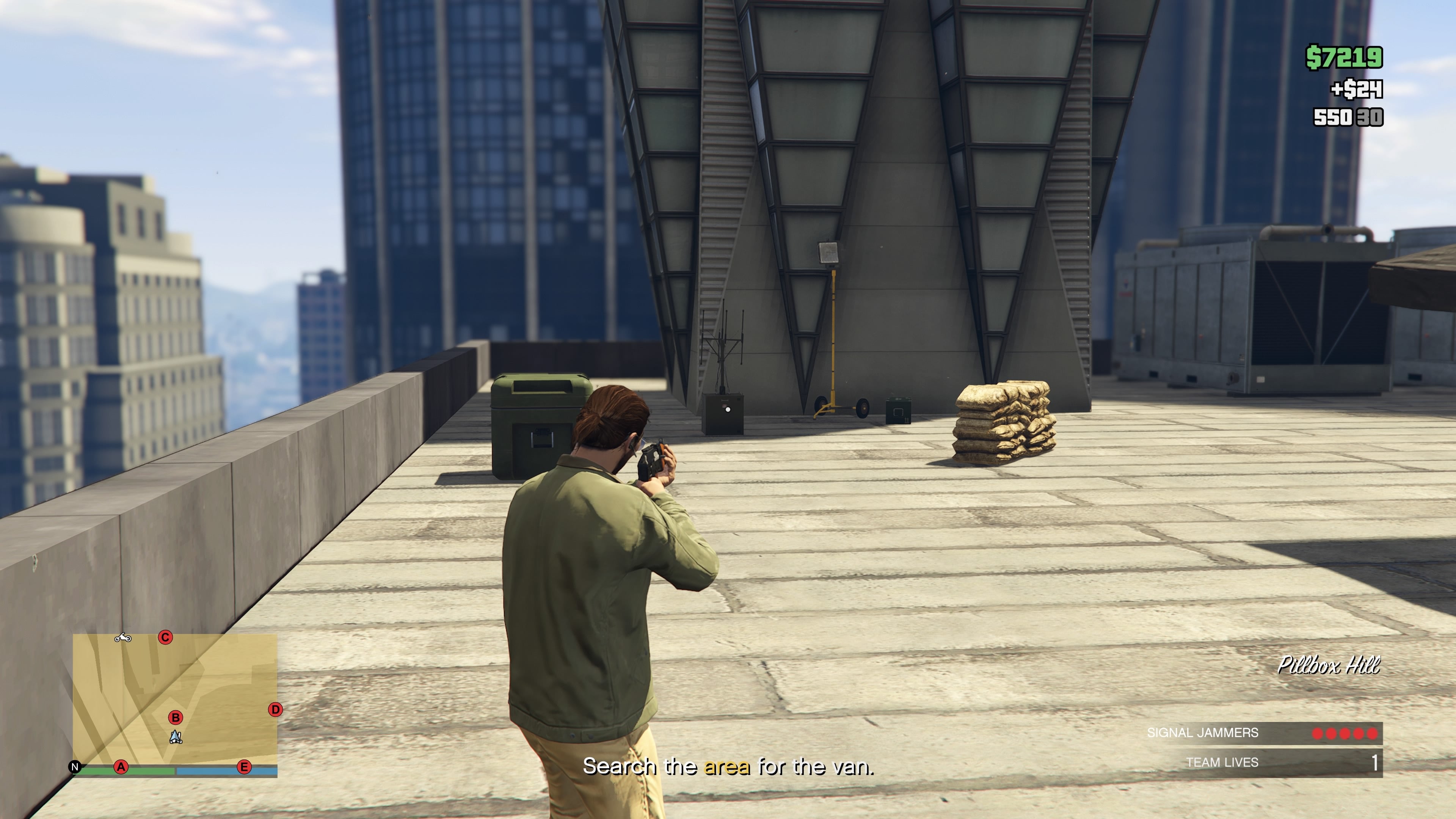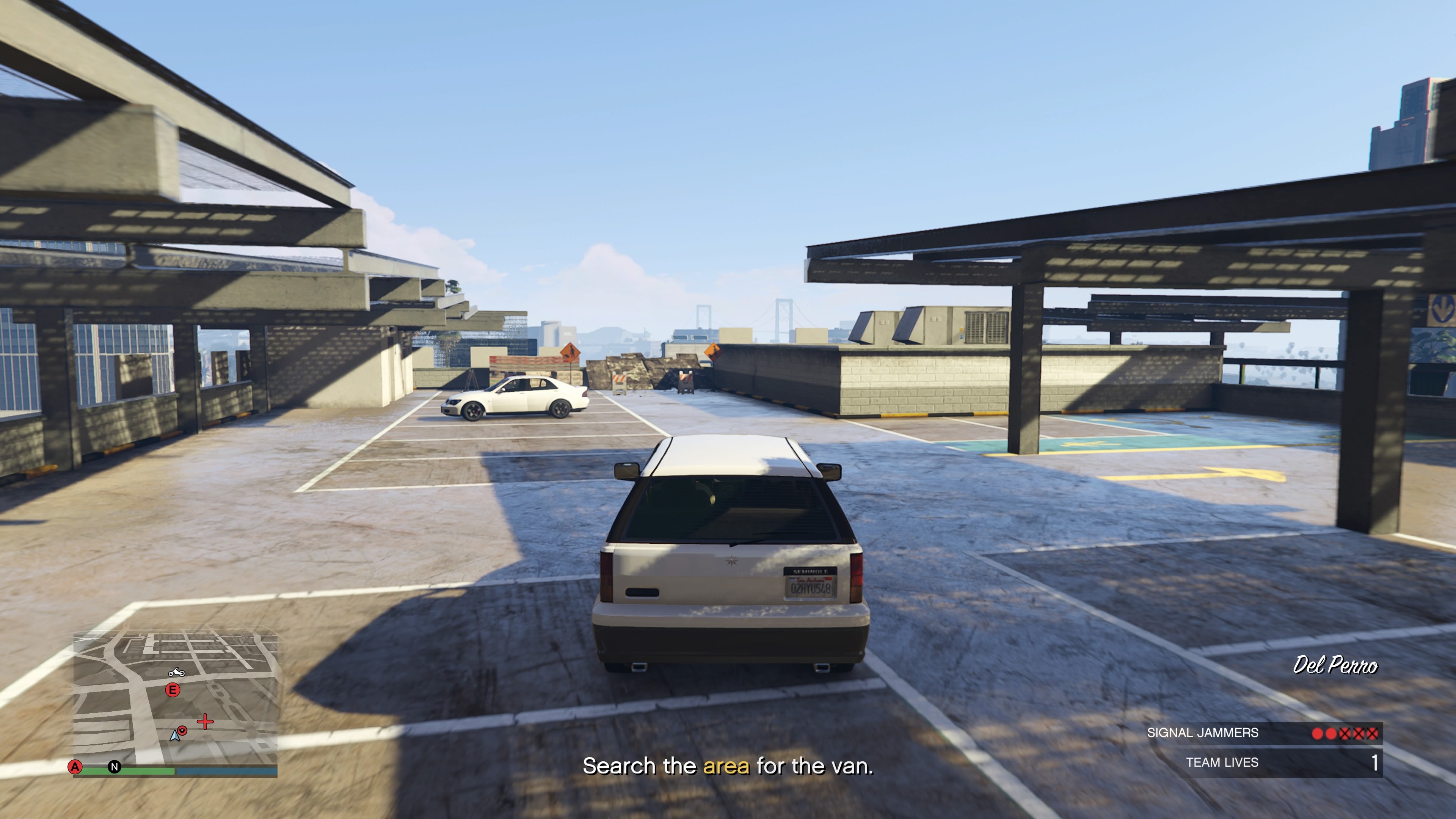 There are five jammers in total, are roughly placed in the same location (although B switched for us between the top of a motel and the top of a skyscraper within the same rough location). You must destroy them all to find the van. While you technically take out the majority then start searching for the van without an exact location, the vehicle changes every time, so you won’t know exactly what you’re looking for aside from a general vehicle type. Not ideal.