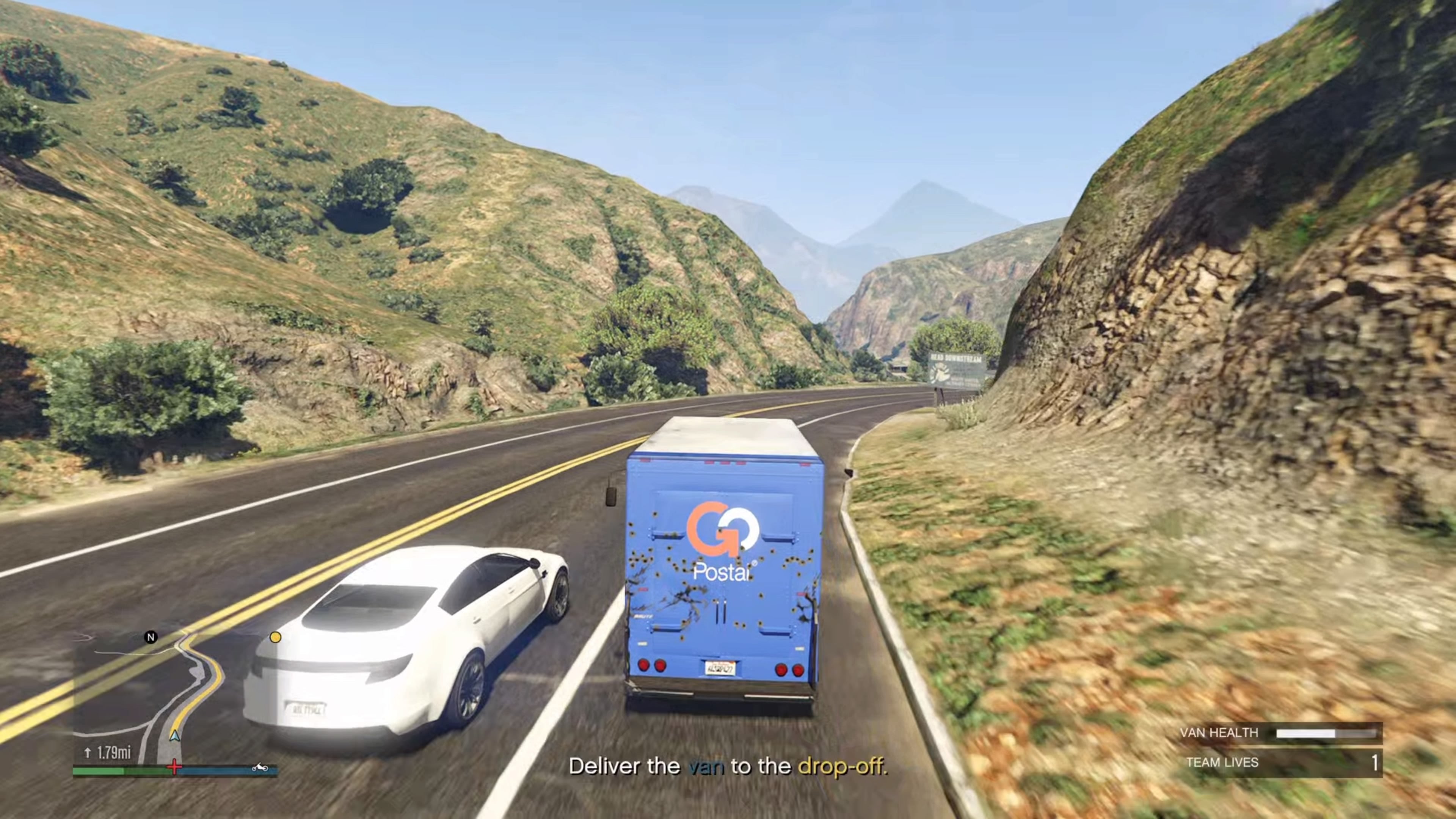 First off, congratulations! You’ve unlocked a checkpoint that means if you die now, you can quick restart the mission with the van already in your hands. For this final step in the mission, you need to drive from Vinewood all the way up the mountains and into a lonesome lodge around 3.5km north. This means driving slowly up hills, and bombing it back down again in a vehicle type that doesn’t handle super well.