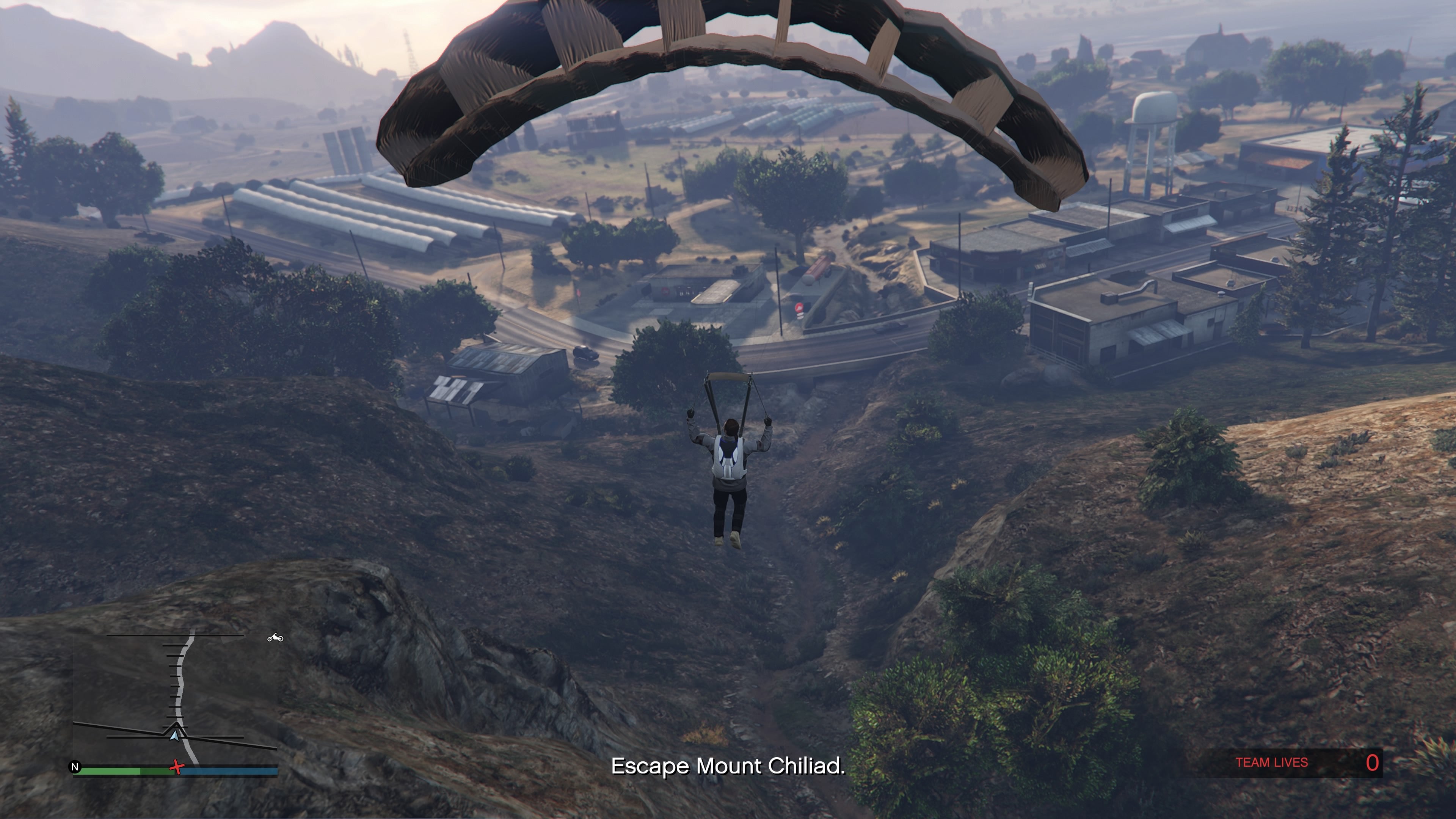 Once you make it outside again, you’ll be confronted by enemy helicopters. Shoot down the first one that confronts you at the silo - then run to the parachute point on your minimap. From there, jump and parachute your way down the mountain. You will be pursued by another chopper, but consistent swinging from side to side will avoid the vast amount of damage coming your way. Once you reach the street, steal a car (or take your own) and race to the hand in point. With this, the mission chain is finished!