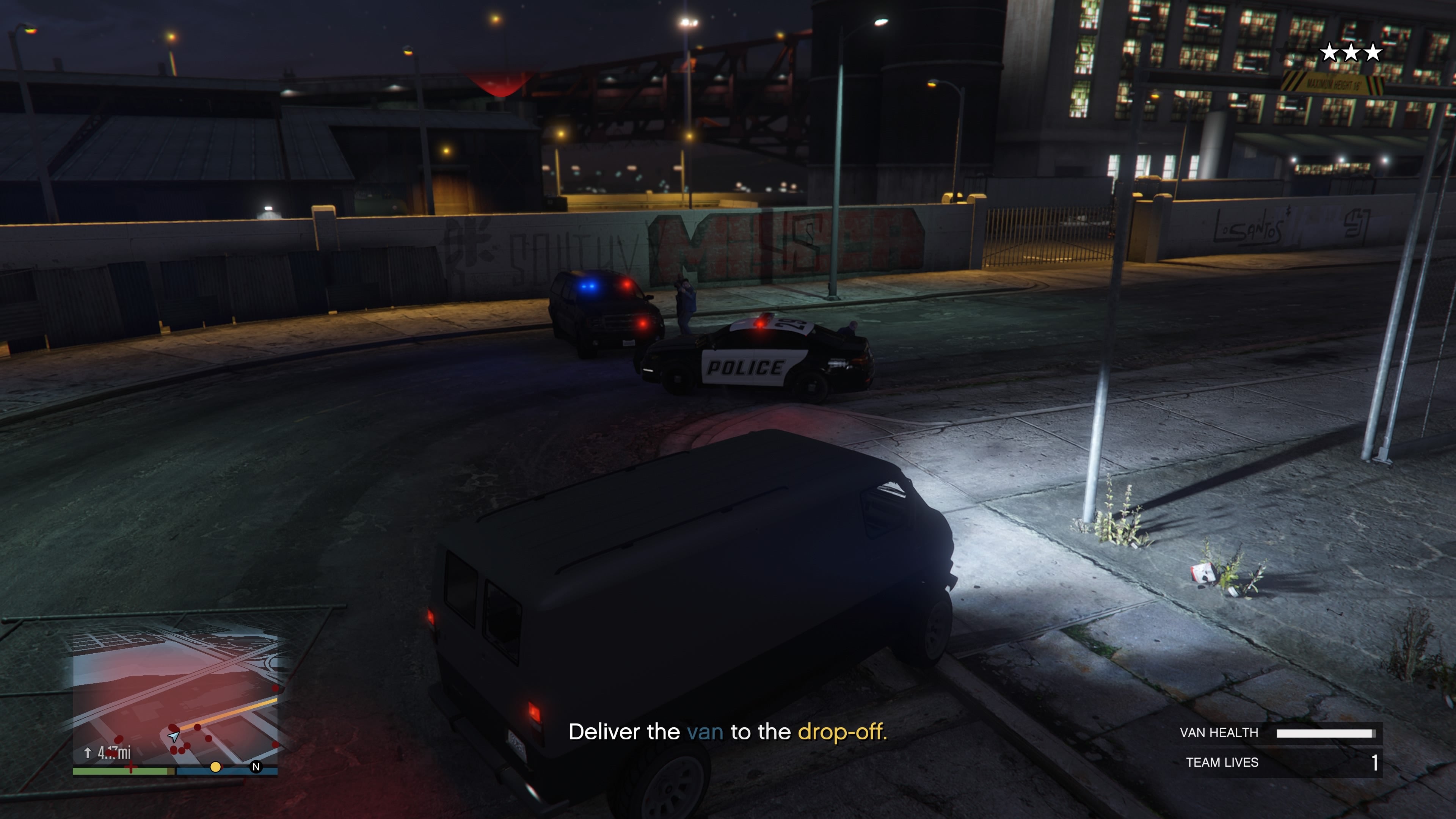 The van itself is quite tanky, but police will try and run you off the road and shoot you to death. If you’re playing solo, try and stay ahead of them and focus on avoiding crashing as this will make it far easier for you to get shot and killed. If you’ve got a free moment, try and shoot out police wheels or drivers to lessen the danger.