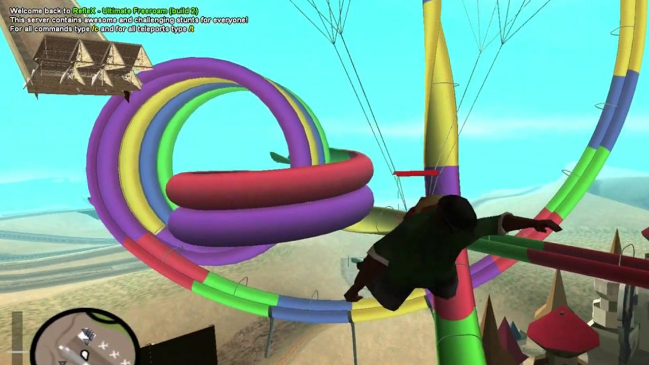 San Andreas might be bursting at the seams when it loads up a heavily modified stunt server filled with custom assets, but 200 (or even 300!) players are having the time of their lives crashing into each other and finding new ways to perform rad tricks. They may be lagging all over the place, but the performance, it seems, is part of the charm.