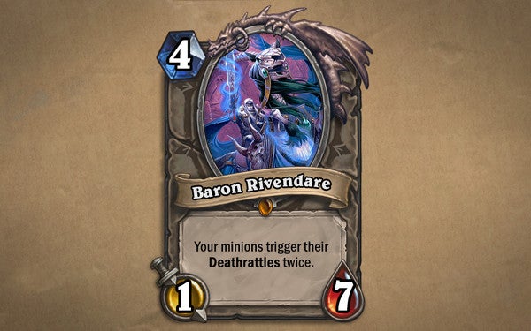One of the most eye-catching cards is the new legendary card (legendary meaning it's very rare and can only be included once in your deck) called Baron Rivendare. A mid-cost card with low attack and a ton of health, Rivendare causes your other minions to trigger their deathrattles twice if they expire while he's in play. "In a lot of ways I'm excited about that card because I don't know exactly how players are going to use it," says Dodds. "It's one of the types of card that we call a story card -- it's a card that the number of possible combinations for it are crazy and once it gets out there we expect to hear some crazy stories that come out of it."