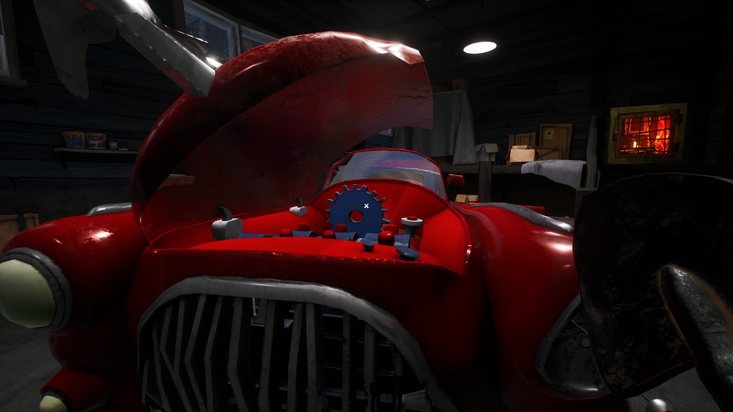 But for the cog, place the ornament from the office on the front of the car to pop the hood.