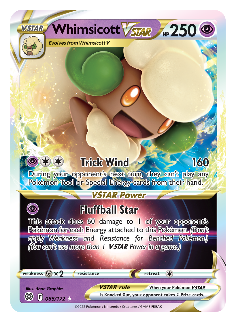 “There's mischief in the air when Whimsicott VSTAR floats onto the battlefield! The Windveiled Pokémon is renowned for its pranks, and none more so than its Trick Wind attack which prevents your opponent from playing either Special Energy cards or Pokémon Tools! If trickery is not enough, the Fluffball Star VSTAR Power can deal 60 damage for each Energy attached to Whimsitcott, to any one of your opponent's Pokémon!”