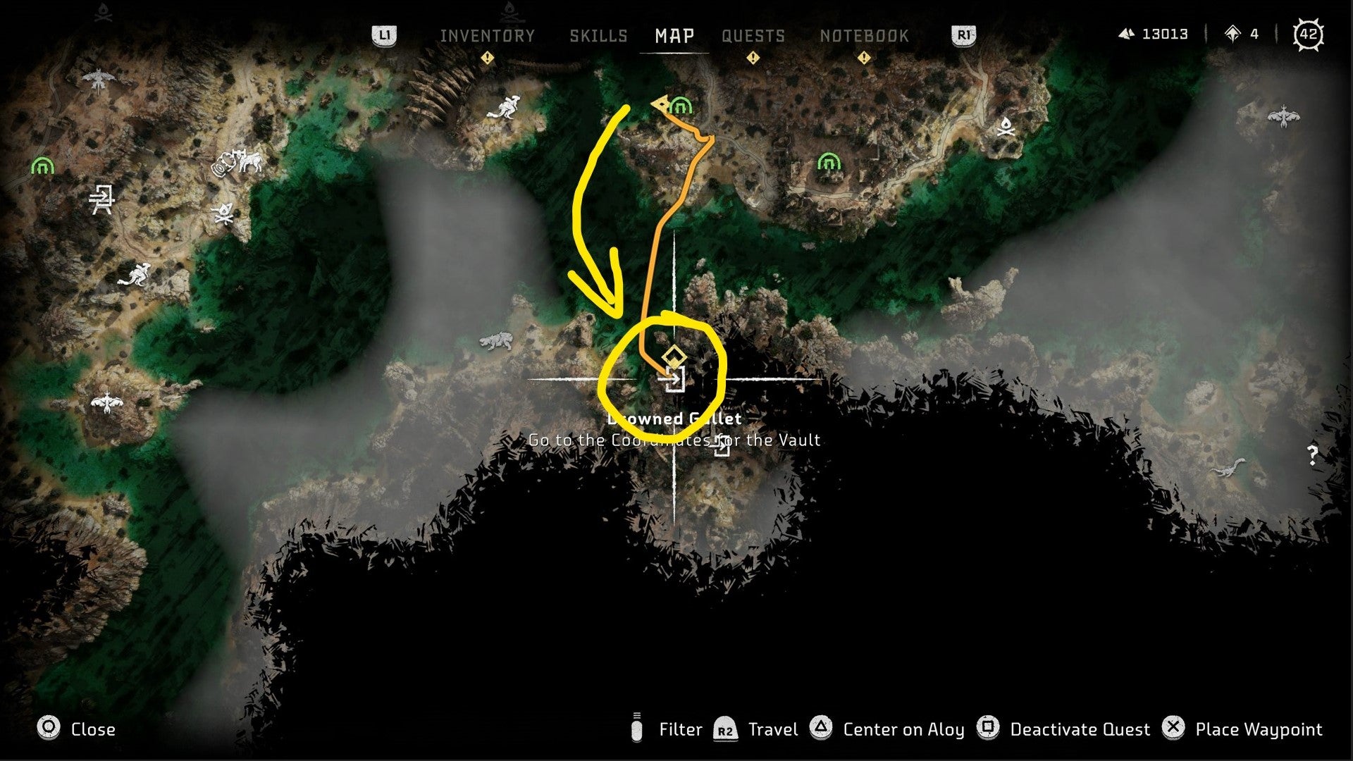 Your last set of coordinates sends you south to Drowned Gullet. Again, swim underwater through the entrance and make your way along the path when you resurface.
