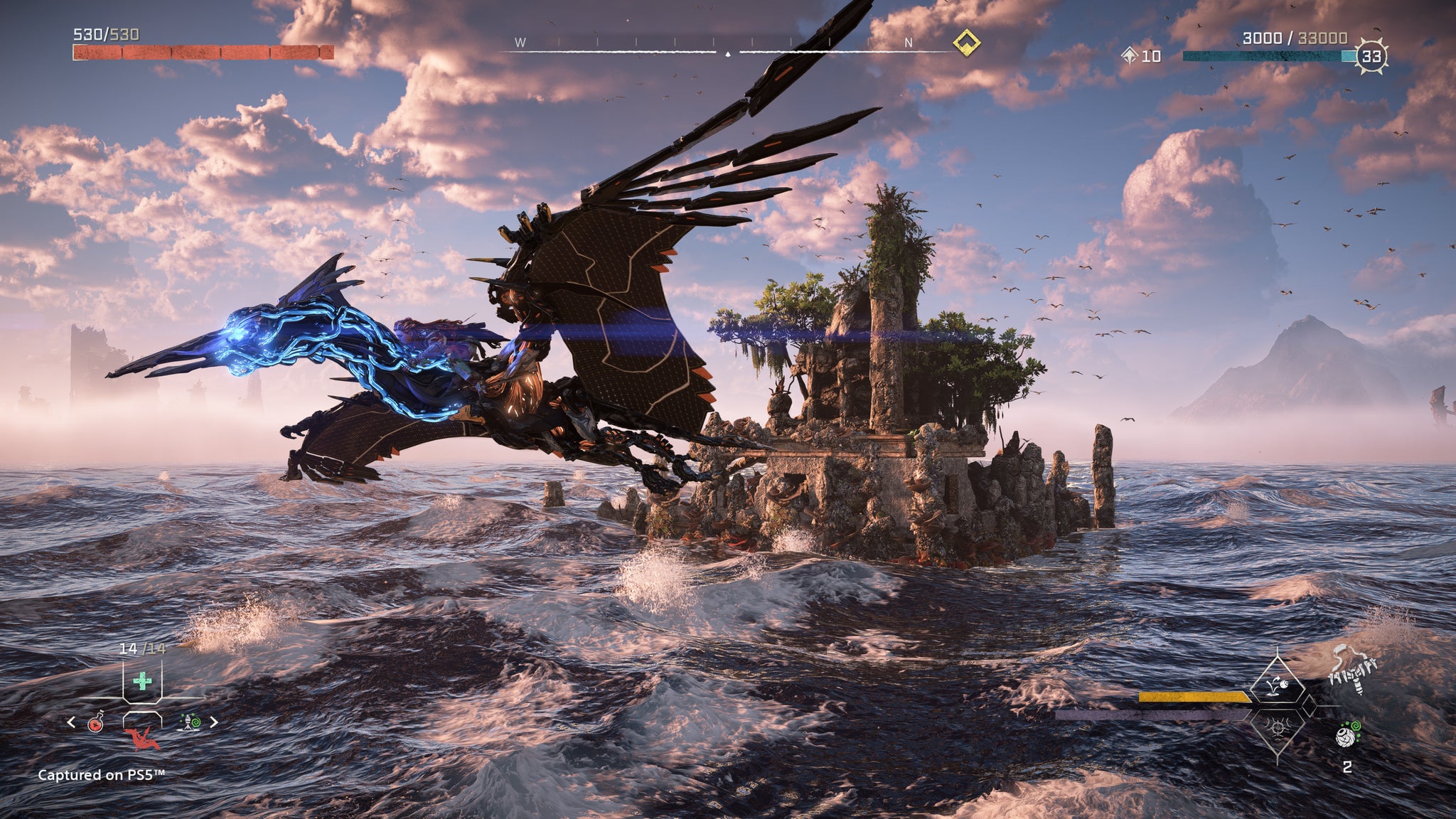 It helps that this is one of the best-looking games I’ve ever played, too. Being tossed from the top of the map to its left-most extreme is bearable if I’m going from frozen mountains to lush, West Coast beaches. ‘Hey, maybe I’ll stop off at that jungle village en route to mop up that combat pit quest,’ I think as I set out on what will no doubt be a three-hour detour. An hour of that is in Photo Mode, as I try to capture Aloy’s face as she gets clotheslined off her mount into the snow, and some electric-fanged panther thing comes diving at her.