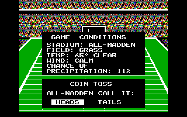 Adding further complexity to the simulation, Madden allowed any number of other variables to affect matches. Players could select from several inclement weather types, allow tracking of different penalties, and even enable negative effects like player fatigue and injury. About the only thing missing was season play and a career mode; in its original incarnation, John Madden Football simply consisted of single match-ups. But those isolated games offered unprecedented detail and substance, with John Madden himself available to offer strategic advice as needed. And, it should be noted, the game didn't consist entirely of thumbing through play books; once the ball was hiked, players took an active role in controlling the quarterback and receivers as well. The action was a good deal more sedate than something like Atari Football, but it still went a long way toward creating greater immersion and involvement.