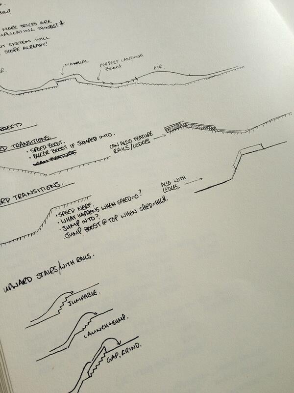 "The actual assets -- what will go in, with ledges and rails -- that was all in paper first, and then the most terrifying Excel document I've ever made," says Ribbins. "I think I spent a month trying to get really good at Excel, and modelling how many pixels he'd go off any particular obstacle at any size at any given speed, and you could modify variables in the Excel spreadsheet, so you'd see that if you had this many obstacles what kind of score you'd get."