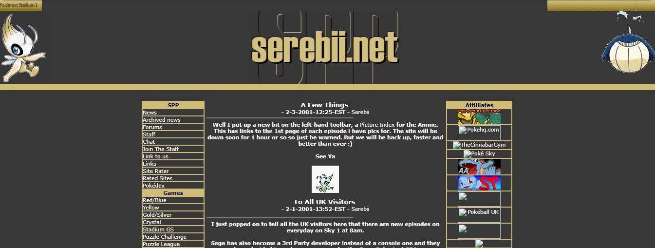 Serebii's name alone carbon dates the site. "Serebii" is the Japanese name for the legendary Pokemon Celebi—Pokemon Gold and Silver's answer to Red and Blue's Mew, more or less. With so many Pokemon sites named after commonly-known Pokemon at the time, Joe decided to opt for a name that felt a little mysterious.