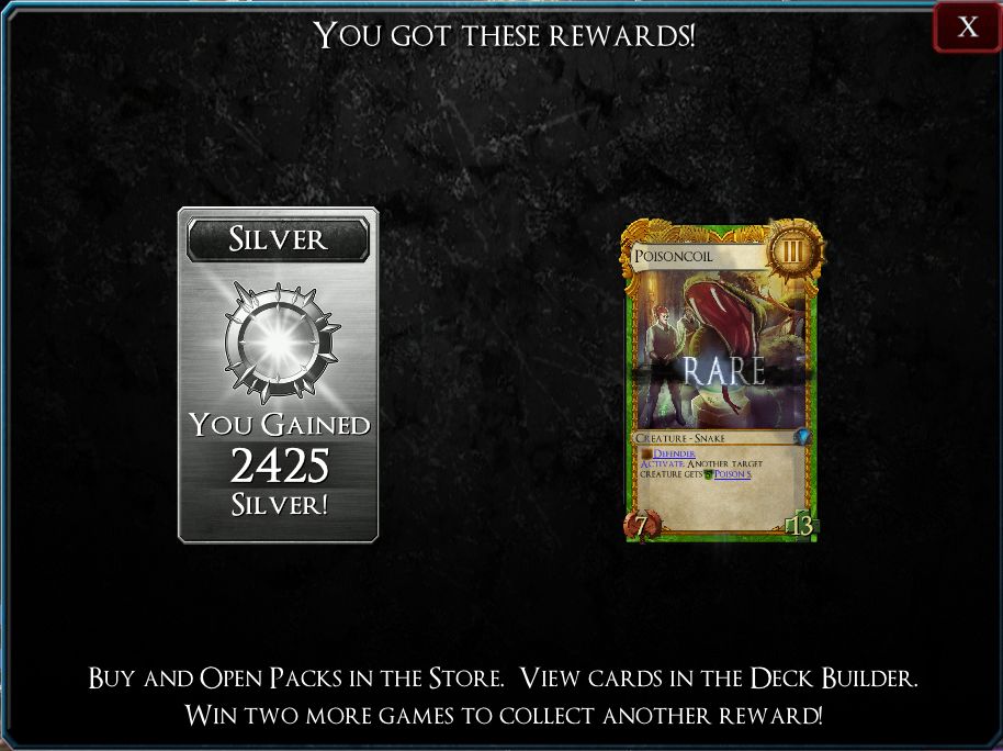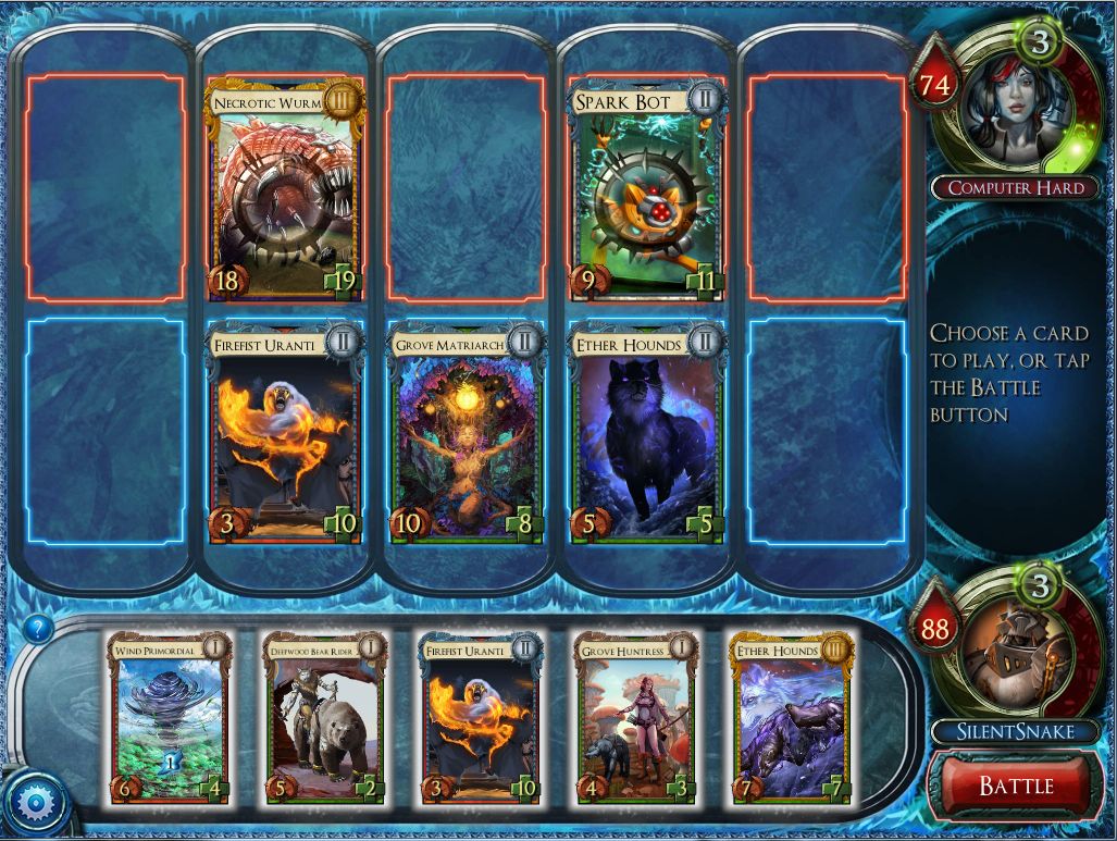 The influence of Magic is certainly felt once you dig into the game. Players start at one hundred life and must reduce their opponent's total to zero using a combination of Creatures and Spells. But don't mistake it for being a derivative work, as its differences manage to create an experience all its own. You cannot simply play Creatures and declare attackers and blockers here. Instead, each side of the battlefield holds five slots where Creature cards can be played. Both players' forces must attack each turn except for the ones that just came into the battlefield this turn. If a Creature is unimpeded by an opposing one opposite it, damage equal to its Attack is dealt to the opponent. Otherwise, they trade damage. This dynamic makes positioning matter, especially given you can't move creatures once you've placed them unless they have an ability called Mobility. Some Creatures also grant buffs and other special abilities to adjacent friendly Creatures, or get additional powers when placed in a certain lane. Giving the battlefield a spacial element opens up new dimensions of tactical strategy within a familiar shell.