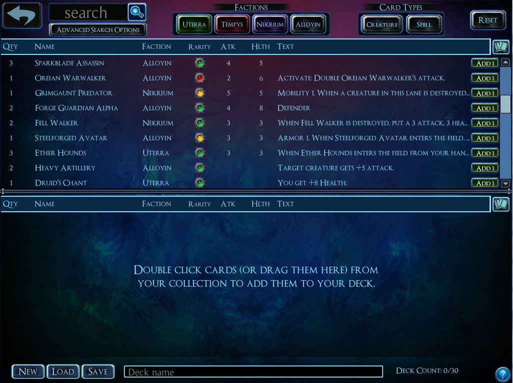 It also addresses the elephant in the room for the CCG genre: cost. Any time you ask players to actively take part in an eminently-expandable card game with random boosters and chase cards, you're requiring a hefty investment up front. Switching to purely digital gives Stoneblade more freedom when it comes to distribution and monetization. The fact that SolForge is free-to-play removes a very big barrier of entry for many would-be card-slingers. “We know SolForge is a lot of fun, so we just want to give as many people a chance to play it as possible,” says Brian. Anyone can build a sizable collection with enough hours put into the game, though if you really want to throw money at it, you can.