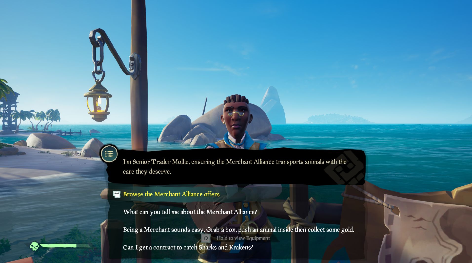 Finally, you can find the Merchant Alliance faction further out on the pier towards your ship. The Merchant Alliance, Order of Souls, and Gold Hoarders form the three factions in Sea of Thieves, and you can pick up a total of three voyages (quests) at one time from any of them.