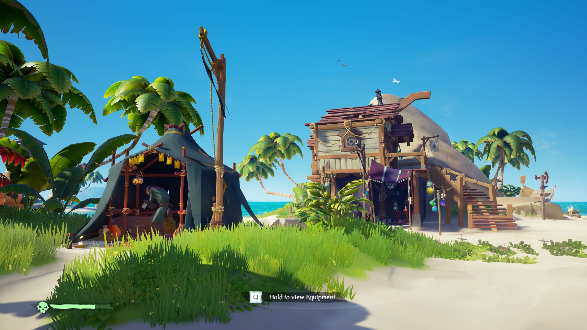 No matter what choice you make over how to start Sea of Thieves (the solo, small ship called the sloop is good while you're learning), you'll begin in a tavern. There are some items you can collect from barrels like bananas which are used to restore your health, but to get anywhere you're going to want to leave and find any of the three merchant vendors that are situated nearby.