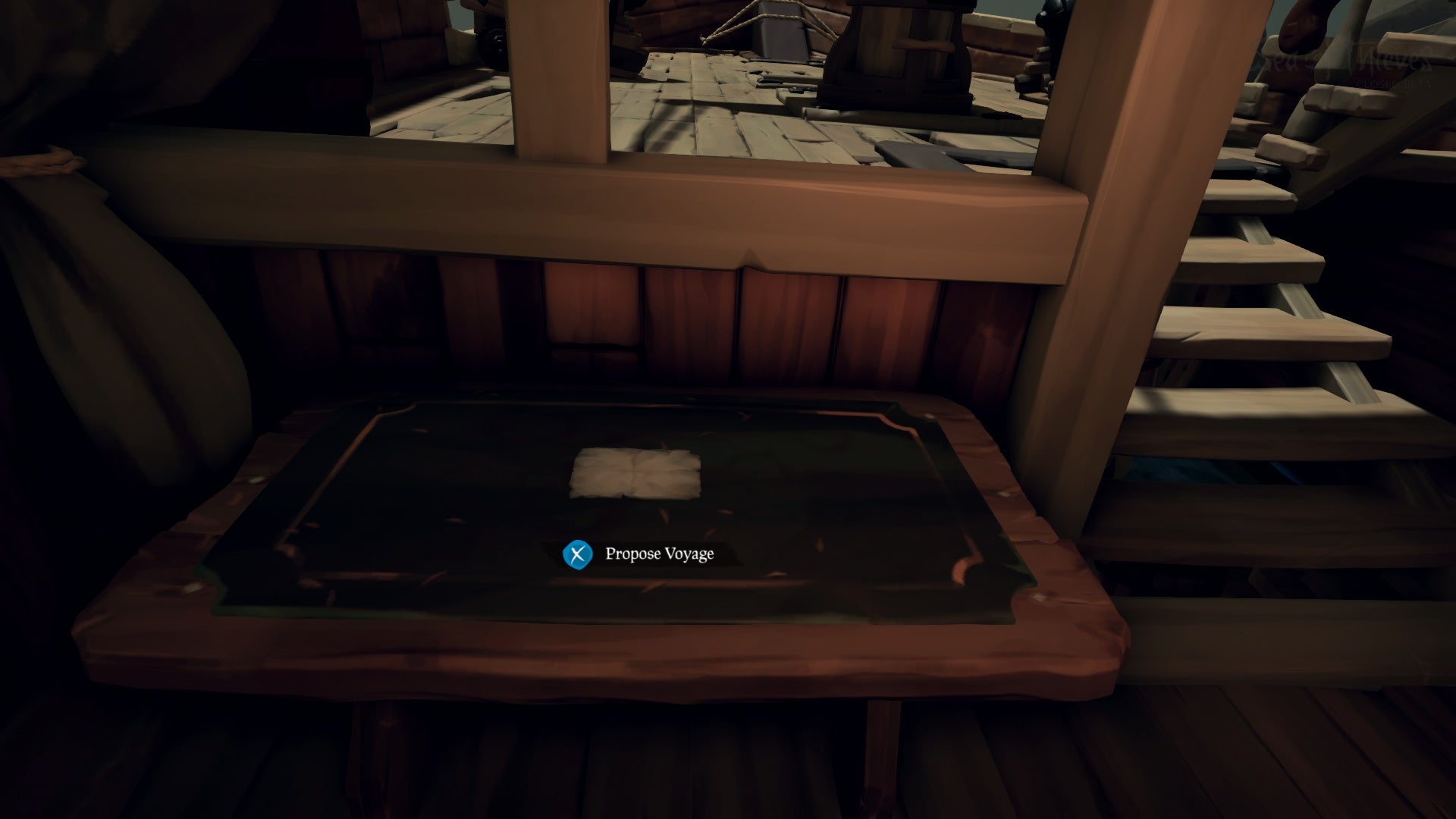 On the lower deck of your boat you'll find a table that contains all available voyages. Choose 'Propose Voyage' and select the voyage of your choice - this will be any of the three voyages that you picked up from the Gold Hoarders, Order of Souls, and Merchant Alliance vendors.