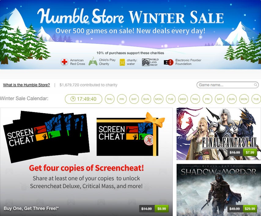 Today's top offers include multiple ScreenCheat licenses, Middle-Earth: Shadow of Mordor, This War of Mine, Roundabout and much more. A handy calendar and countdown will help you keep track of the new offers each day.