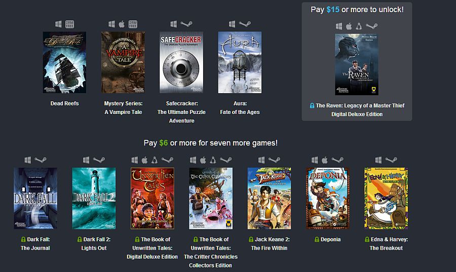 Pay $6 or more and you will pick up Dark Fall: The Journal, Dark Fall 2: Lights Out, The Book of Unwritten Tales Digital Deluxe Edition, The Book of Unwritten Tales: The Critter Chronicles Collectors Edition, Jack Keane 2: The Fire Within, Deponia and Edna & Harvey: The Breakout.