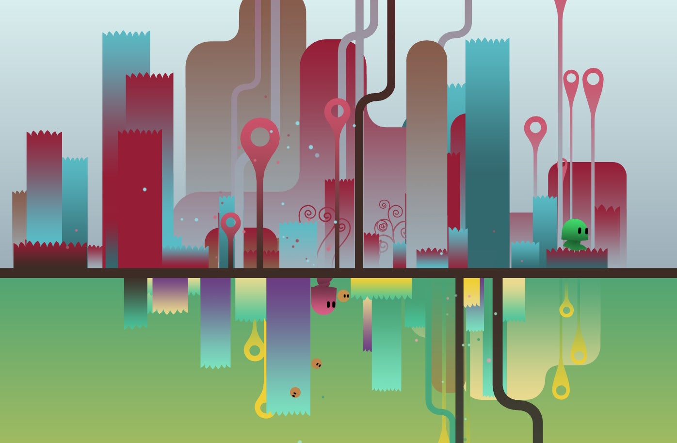 Yet while it looks simple and innocuous, Ibb and Obb's gameplay is anything but. Two local or online players (or a very adept single player) are tasked with guiding the game's stumpy pair of eponymous characters safely through the 15 levels that comprise their rather strange world. Or should that be worlds? Because Ibb and Obb live in an environment split into two mirrored planes, each with its own gravitational rules. Rather than waste any more time explaining it, just have a quick look at the video below, which showcases the concept quicker than it probably took you to read this sentence.