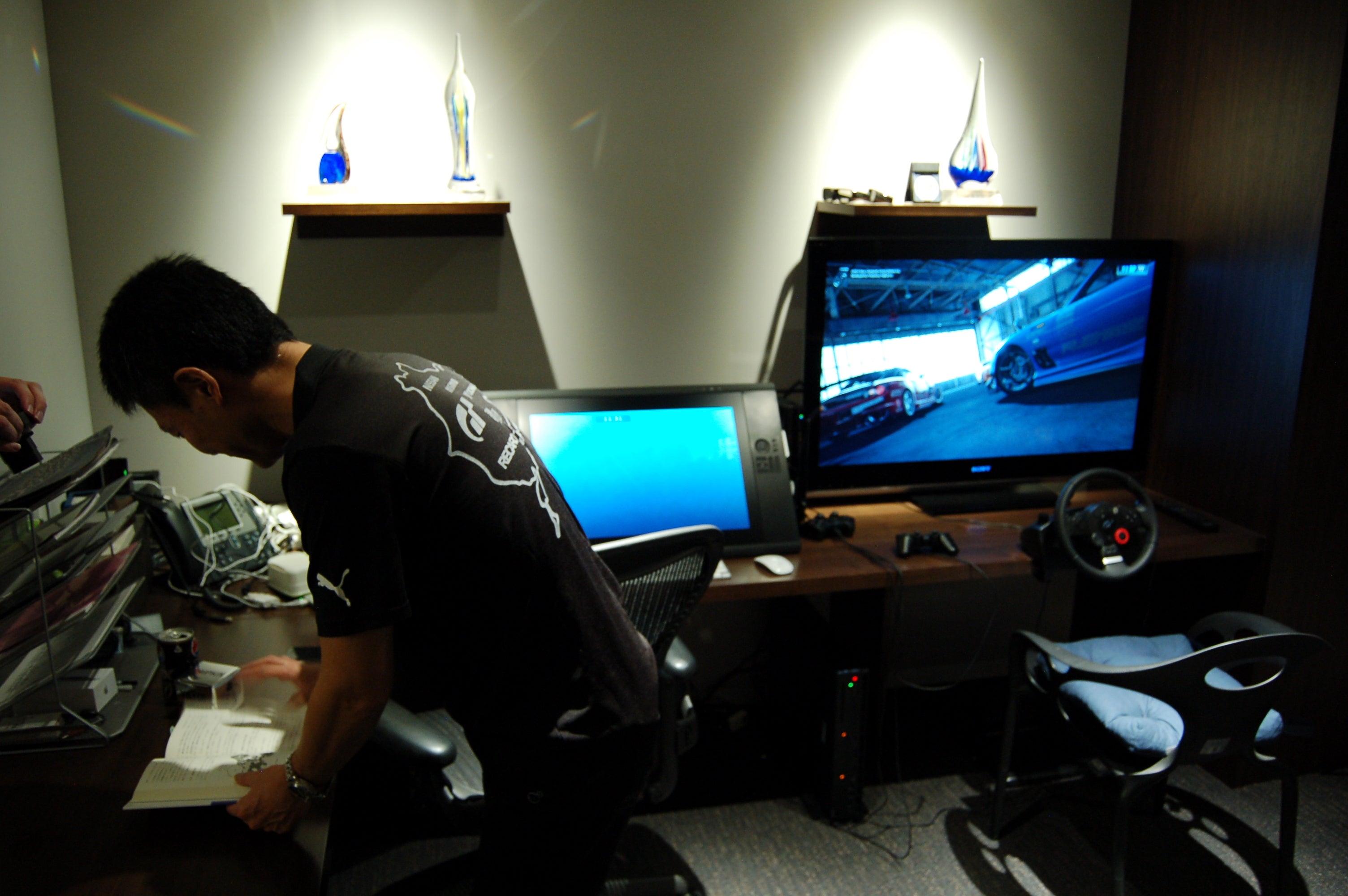 The Tokyo office is just one of Polyphony Digital's studios -- 50 of the 150 staff work in a separate office in Fukuoka, and this screen provides a permanent link between the two. The numbers in both fluctuate, too -- in the wake of the Fukashima disaster many of the staff and their families relocated to the Fukuoka office.