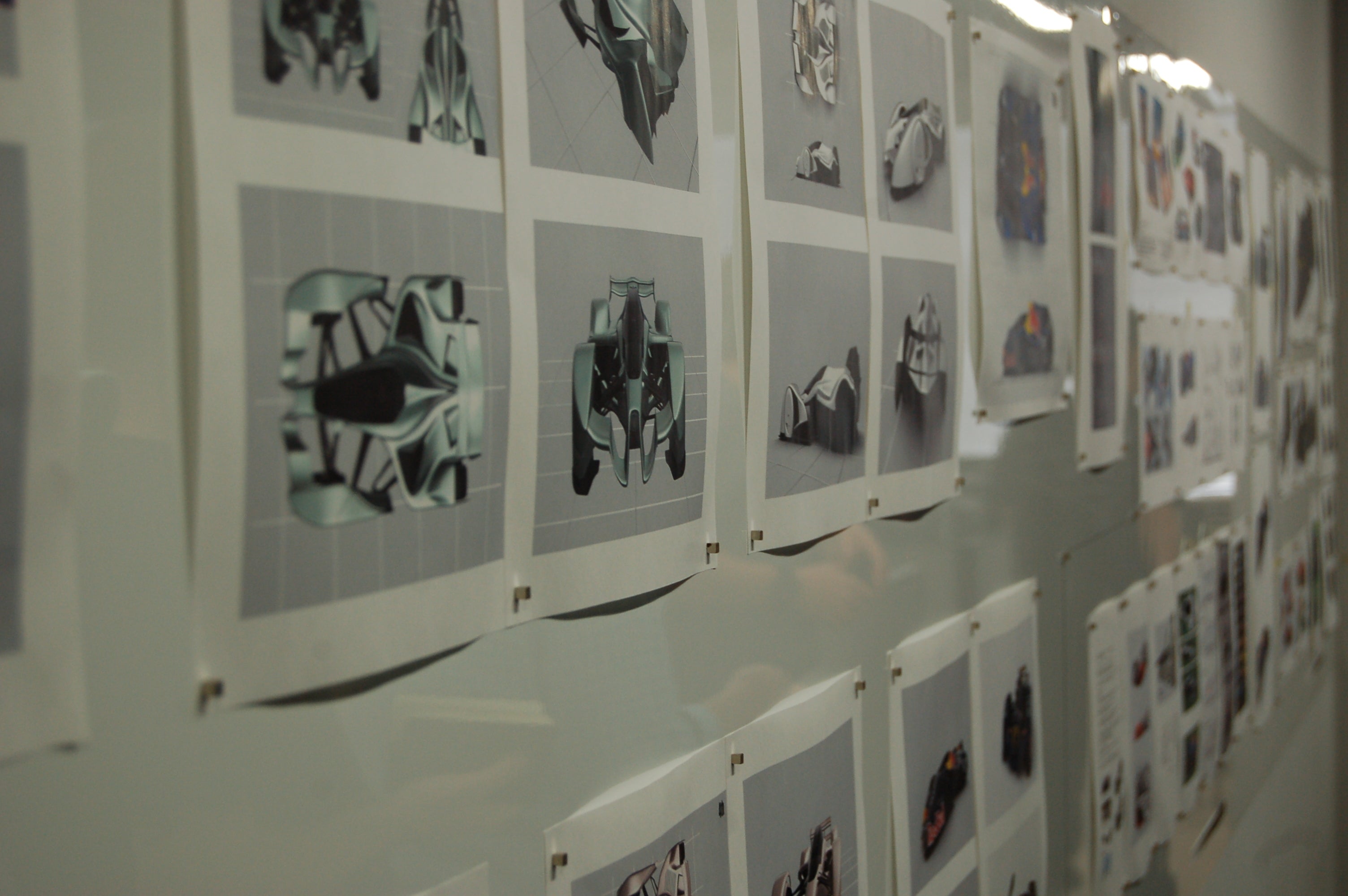 Some designs created in collaboration with Adrian Newey for the Red Bull concept car. At the far end of the wall were designs for the X2014, Gran Turismo 6's updated version of the ludicrously quick car.