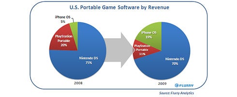 iPhone has increased US handheld market share 14 percent to 19 percent in the past year, according to a Flurry report, at the expense of both PSP and DS.
