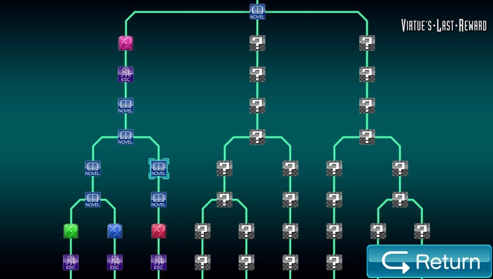 You may recall that a few weeks ago I enthused extensively about Spike Chunsoft's Nintendo DS visual novel Nine Hours, Nine Persons, Nine Doors. Well, since beating that game I've been delving into the Vita version of the sequel Virtue's Last Reward, and I've been very impressed so far.