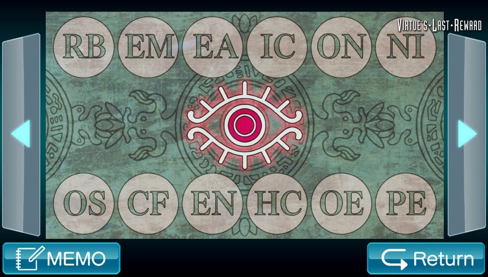 Like its predecessor, Virtue's Last Reward is primarily a multi-path visual novel that occasionally interrupts all the reading with a room escape sequence, during which you must make use of your brain and any objects you happen to find lying around in order to make your way through a locked door. These escape sequences frequently make use of a combination of different puzzle types, ranging from adventure game-style "combine two objects then use them on something else" object manipulation to more in-depth minigames that unfold on a separate screen.