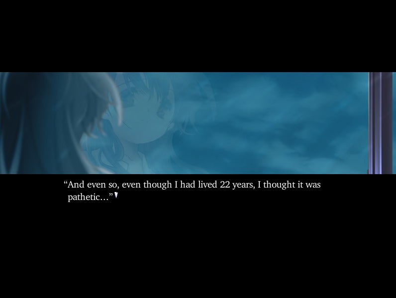 The game is presented somewhat unconventionally for the medium; rather than the full-screen visuals and huge character sprites normally seen in games of this type, Narcissu displays its images as a very narrow band in the middle of the screen, accompanied by either voiced or unvoiced narration text; in the case of the English translation, different people worked on the two versions so as to provide different perspectives on the narrative, which is an interesting approach. The game draws heavy inspiration from both road trip movies and writer Kataoka's previous work Gin'iro, a commercial work that, despite its medieval Japan setting, shares some themes and ideas.