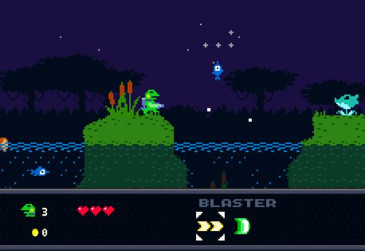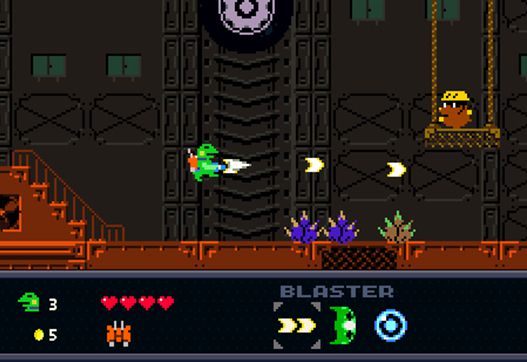 In Kero Blaster, you take on the role of a heavily armed frog tasked with clearing weird black furry things off a network of teleporters. You achieve this goal by fighting your way through a series of linear stages, running, gunning and jumping your way to victory. Each stage has at least one boss encounter, and as you progress through the game you'll both collect new weapons to add to your arsenal and upgrade the ones you already own using coins you collect.