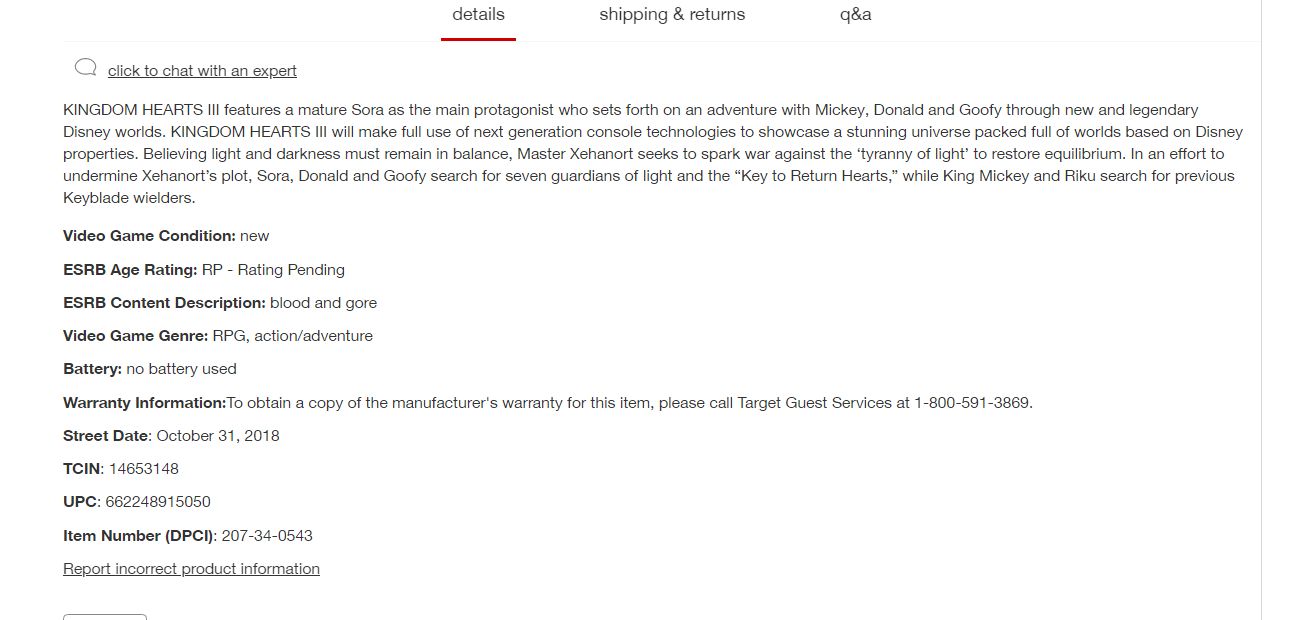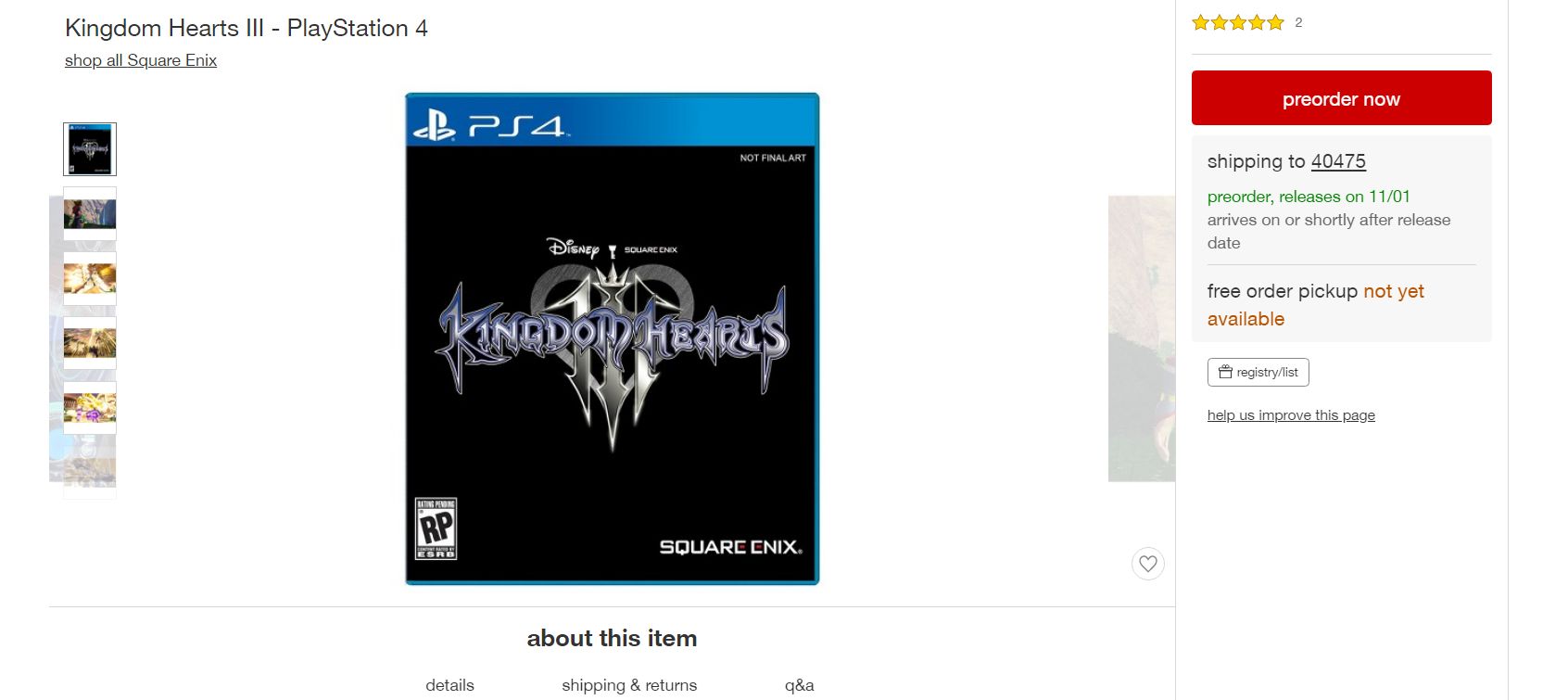 According to a pre-order listing on the Target website, Kingdom Hearts is set for release at the end of October.