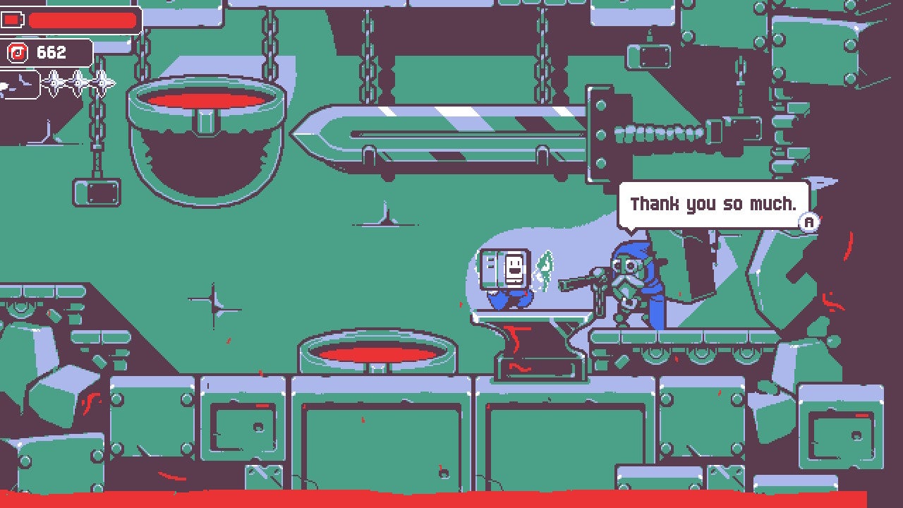 Visually, Kunai leans on the idea of less is more. The sprites have a Metal Slug feel to them: they look weighty, but also remarkably fluid in motion. Tabby is a joy to watch as his tablet face animates in a host of gleeful faces depending on what you're doing. Many of the enemy and NPC designs, like one blacksmith you meet later, are quite distinct.