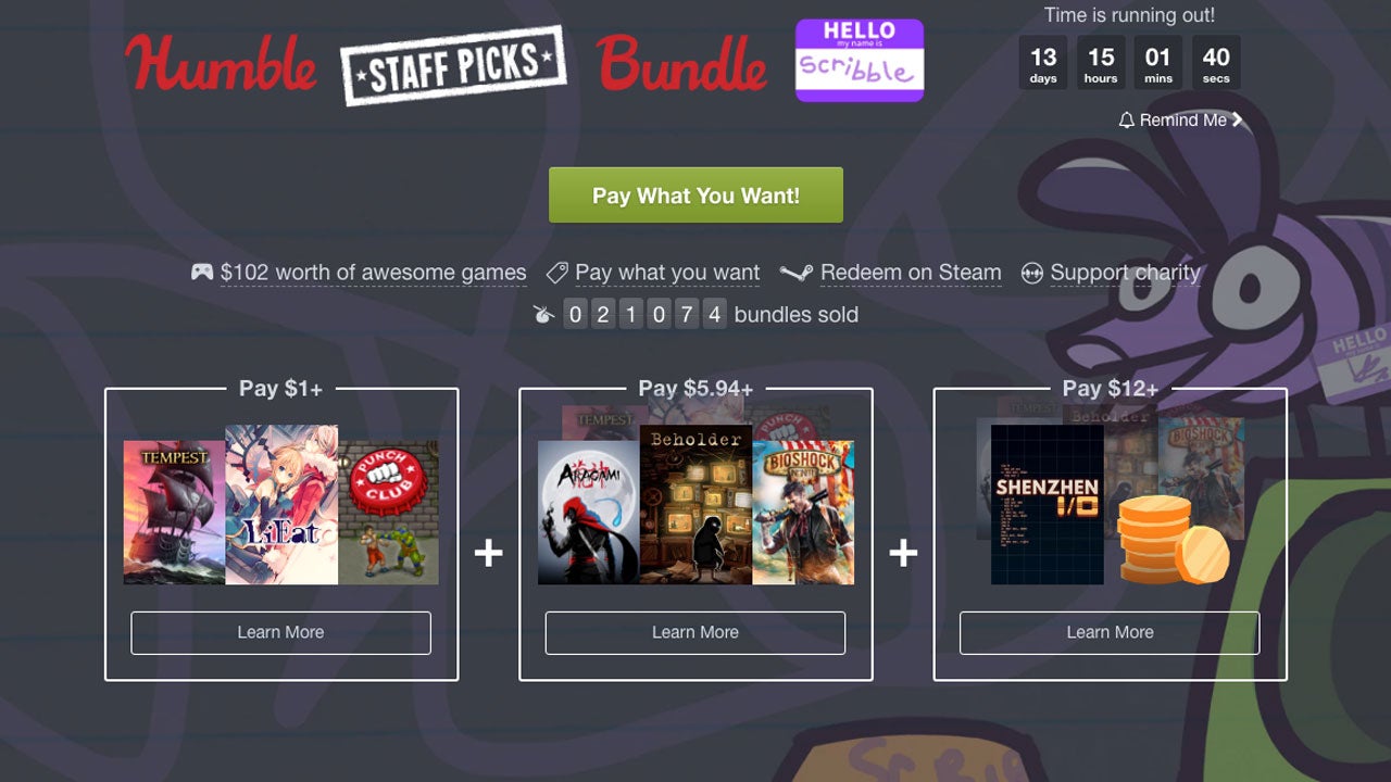 The latest Humble Bundle is another staff pick affair, but this time the staffer in question is a crayon dog called Scribble. Apparently she is our friend, likes scritches and made the company letterhead. I don't pretend to know or care what this whimsy pertains to.