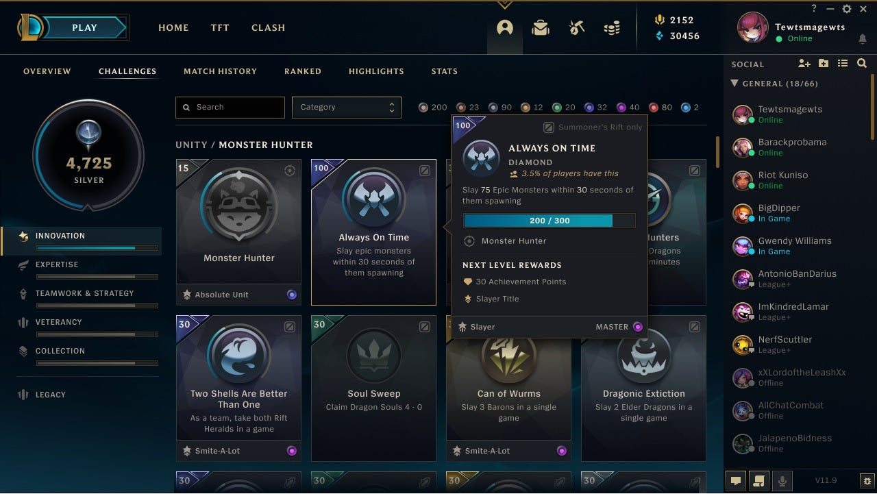 But how does this all work? Well, as soon as the challenge update goes live tomorrow, you’ll be able to see a new tab in your profile menu. There, you’ll be able to see your overall challenges rank via a big crystal on the right of the client, with individual challenges browsable as you would your skins, summoner icons, and so on.