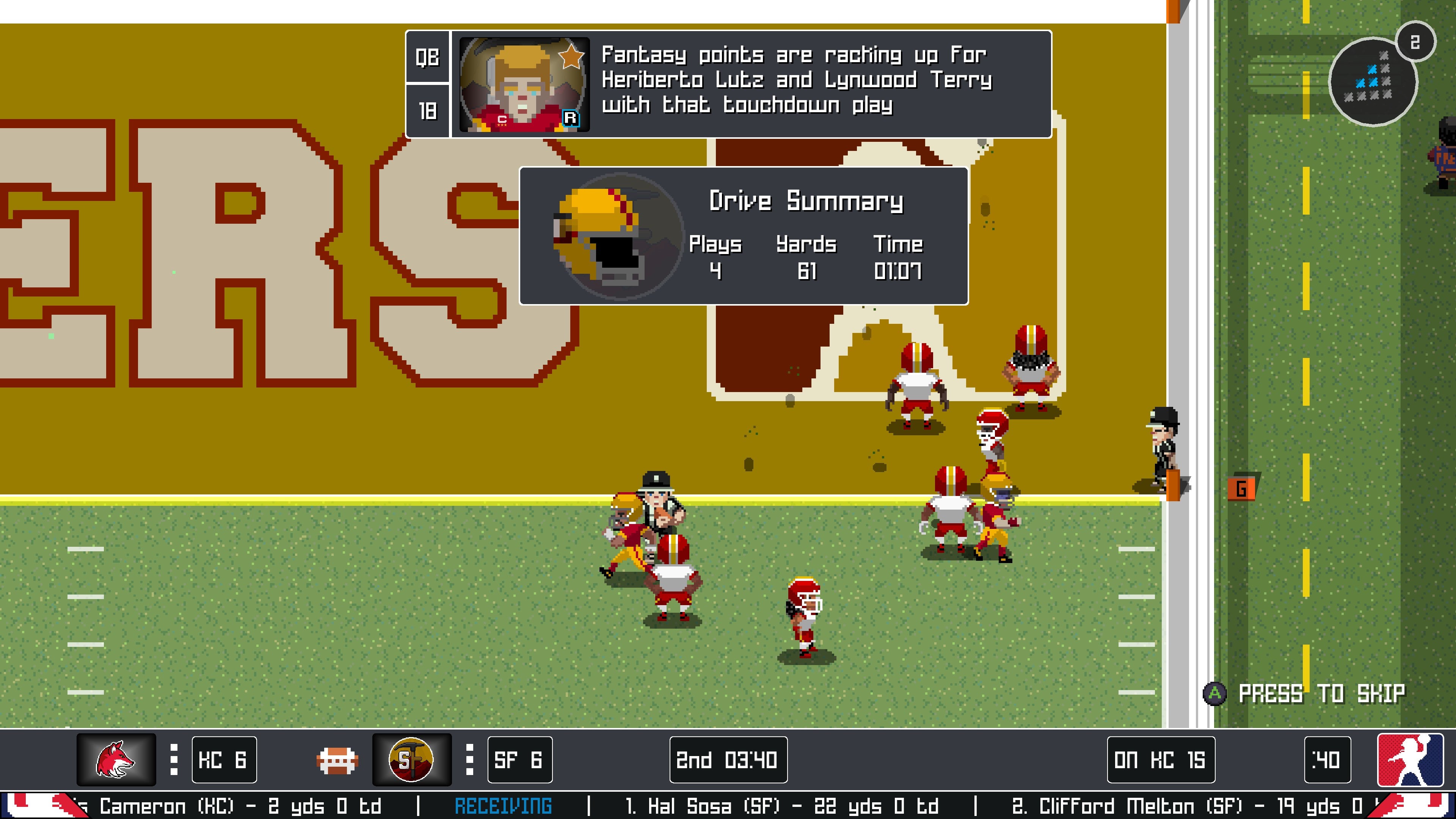 Like the lack of a franchise mode, the criticisms I do have seem like the sort of thing to address in a sequel or large update, not the sort of thing I can use to explicitly drag the game down. The AI is sometimes a bit dubious in its decision-making, and it feels like there’s some Blitz-style aggressive rubber-banding going on to keep games competitive. It can be hard to see your downfield receivers on deep attempts. Passing is a nightmare at first, even when contextualized by the tutorial, and though it eventually clicks the game should do more to teach players how it works.