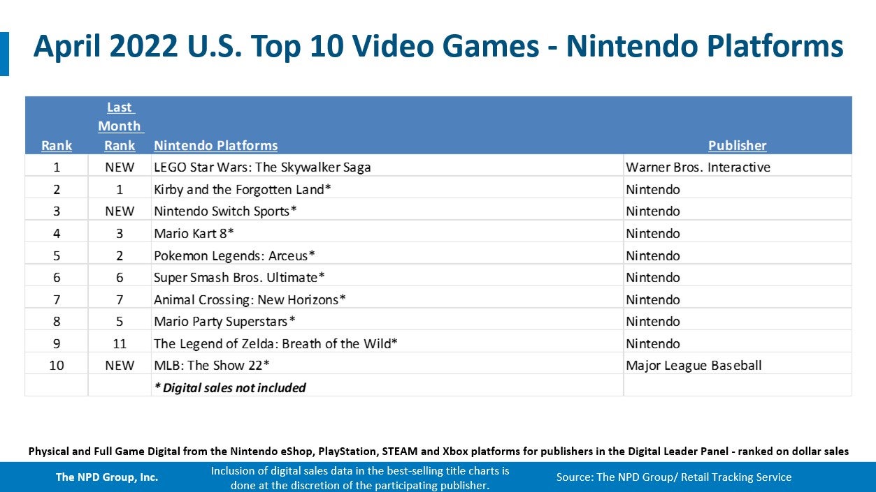 Rounding out the top five for April, in third place was MLB The Show 22 followed by Kirby and the Forgotten Land, and Nintendo Switch Sports, respectively.