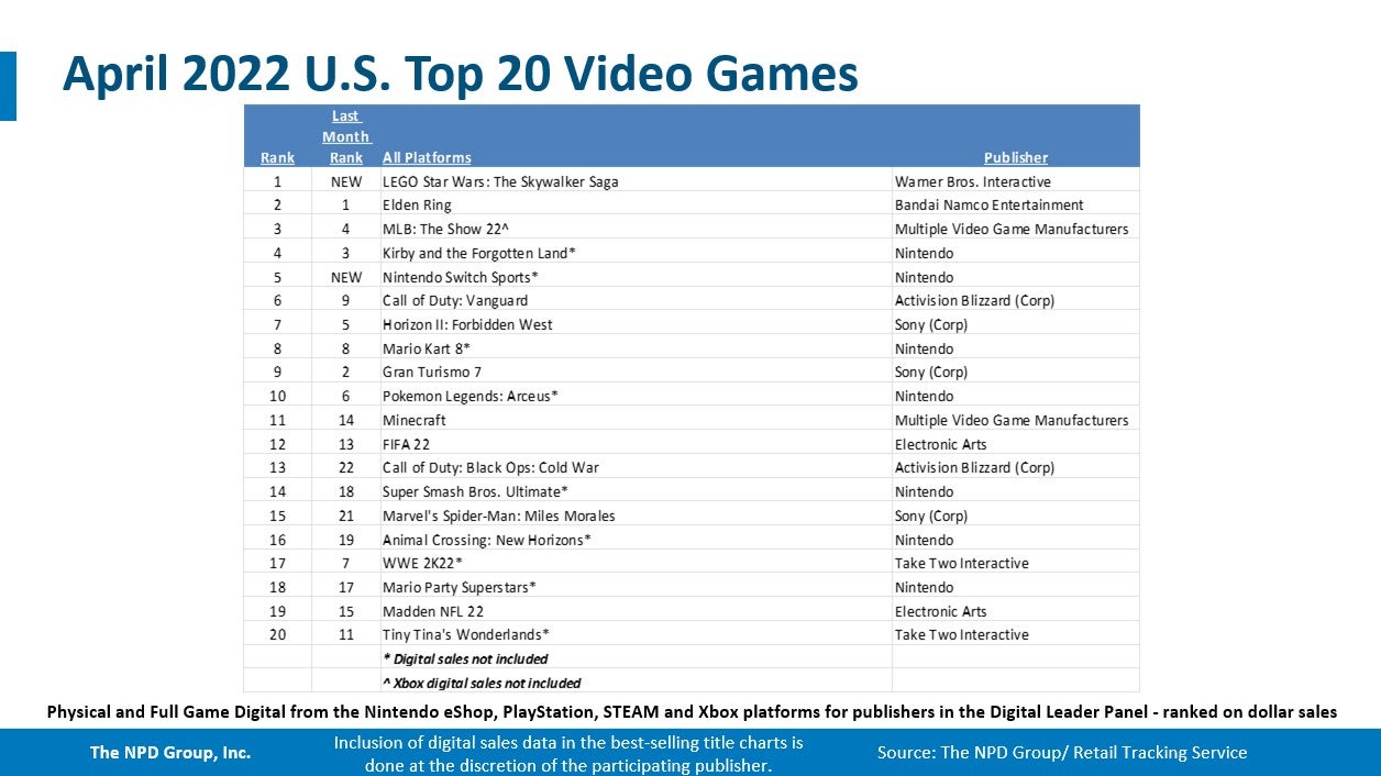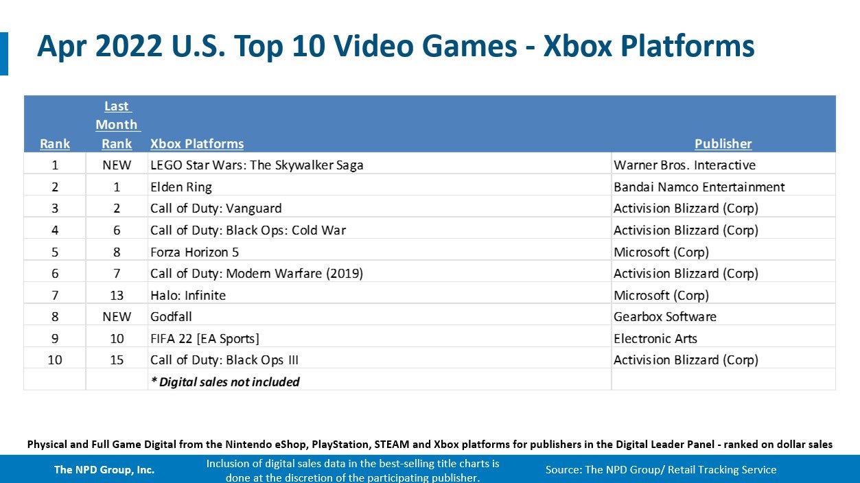 Elden Ring, which was the top-seller in both February and March, was the second best-selling title of April, and is currently the best-selling game year-to-date. It has surpassed Call of Duty: Vanguard as the best-selling premium game for the 12-month period ending April 2022.