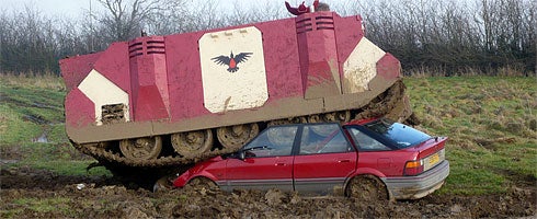 To celebrate the release of Dawn of War II later this month, THQ built a life-sized Space Marine Rhino - it's an APC, if you didn't know - and drove it over some cars in a field.