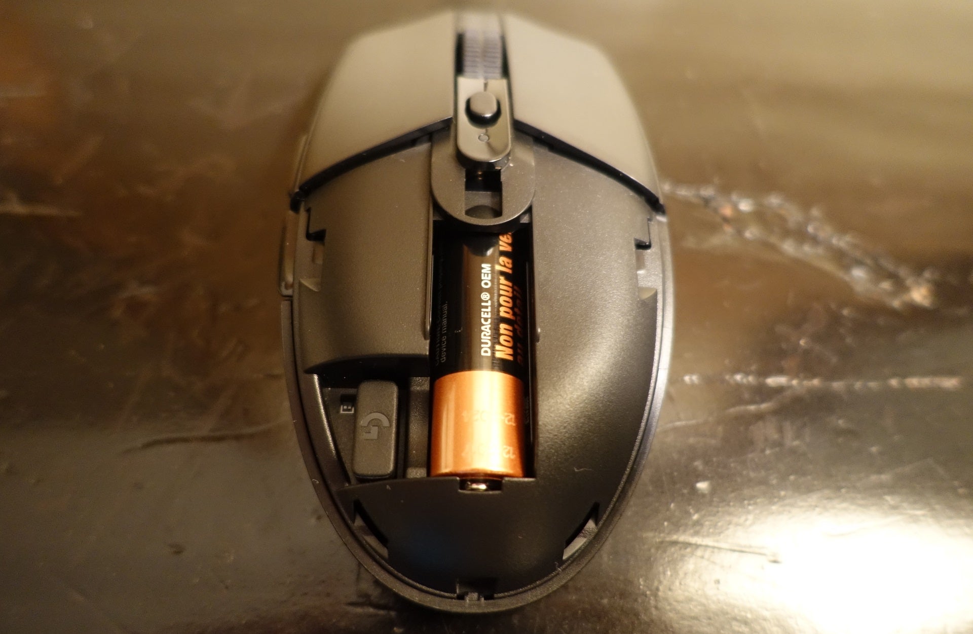 Slide off the rear cover can you'll find a compartment for the mouse's USB dongle and a slot for a single AA battery. Logitech has the battery life rated at 250 hours of gameplay on a single battery in the 1ms Performance mode, and a whopping 9 months in the 8ms Endurance Mode. What you're looking at here is a gaming mouse you can take with you.