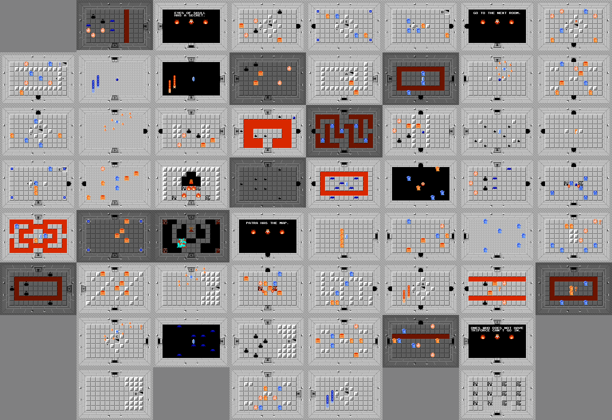 After a while, the non-descript dungeons start to blur together. The relative lack of puzzles make them hard to remember on an individual basis. Each successive dungeon merely piles on more and more enemies, with bosses eventually getting demoted to the status of common foe (bosses, incidentally, might be the easiest part of the original Zelda, usually requiring only a few hits to kill). This progression culminates in Ganon's dungeon - a brutal maze of Wizzrobes, Vires, and Like Likes, the last of which want to eat your hard-earned (and very expensive) Magic Shield. Just for reference, this is the map of the final dungeon:
