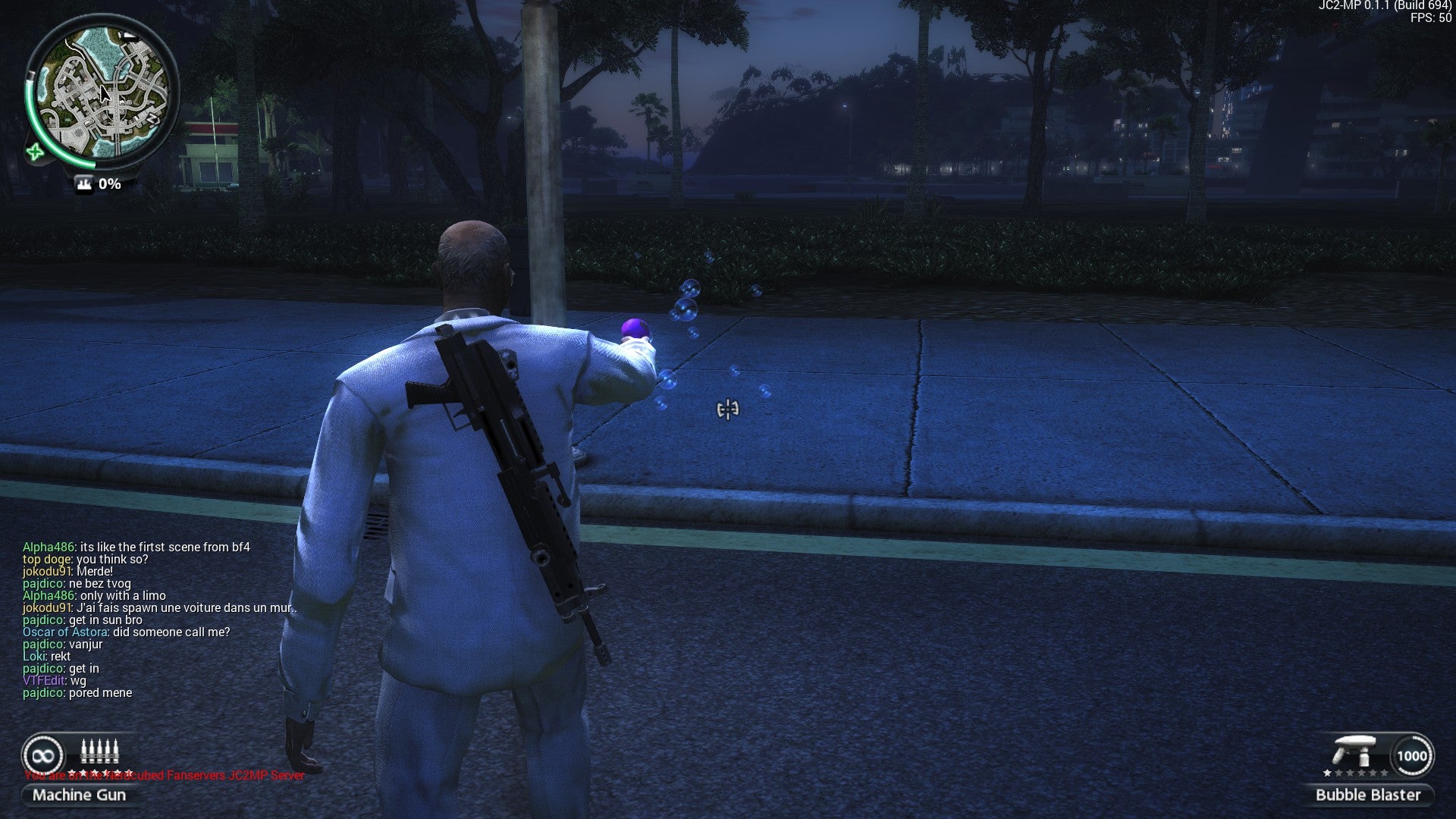 Anyway, armed with all that knowledge, I set off at 11am on a Tuesday morning, bound for multiplayer Panau. I was hoping to quickly meet up with my friend Porkface -- Eurogamer's features editor Martin Robinson -- and spend a pleasant half hour seeing the sights, grappling through forests and jungles and skyscraper canyons, and occasionally stopping to spawn a dinghy and scud into the sunset.