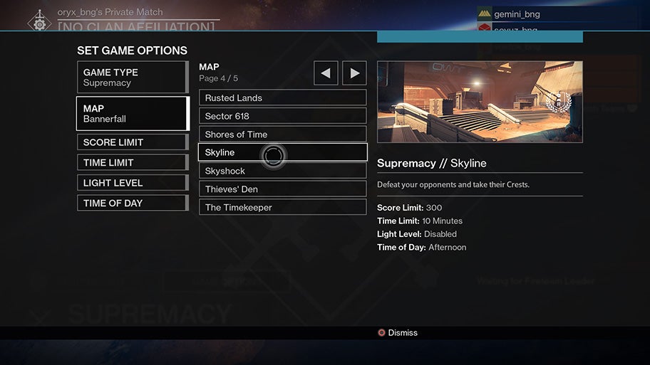 - All players in a Private Match lobby must have Destiny: Rise of Iron to play the Supremacy Game Types, or play on the Floating Gardens, Icarus, Last Exit, or Skyline Maps.