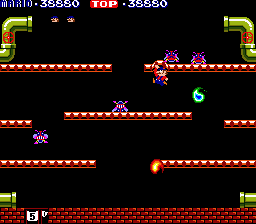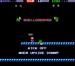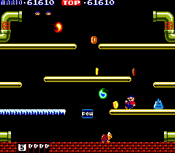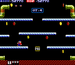 In fact, Mario Bros. feels somewhat unsophisticated even compared to its predecessors Donkey Kong and Donkey Kong Jr. While those games may have lacked Mario Bros.'s more graceful sense of movement, they also offered more concrete goals -- reach the end and defeat the villain -- and a greater variety of stage layouts and mechanics (four apiece in each Donkey Kong game versus the one in Mario Bros.). This could simply be a concession to the move to a multiplayer format -- maintaining a consistent, symmetrical level layout to keep players on equal footing -- but it may also have been a case of Nintendo keeping one eye to the future.